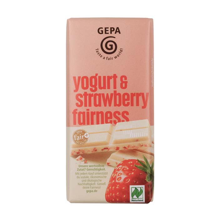 甘酸っぱいストロベリーに、酸味の効いたヨーグルトを加えた、誰もが大好きな爽やかな味わい。■サイズ: H11.3cm×W5.3cm×D0.7cm ■取得認証: EUビオ認証・ナチュールランド・フェアトレードプラス ■原材料: ココアバター ※1 ※2 、粗製糖 ※1 ※2 、脱脂粉乳 ※2 (乳成分を含む)、脱脂粉乳ヨーグルトパウダー ※2 (乳成分を含む)、クリームパウダー ※2 (乳製品)、スイートホエイパウダー ※2 (乳製品)、ストロベリー ※2 (カカオ分:32%) ※1:フェアトレード原材料:65% ※2:オーガニック原材料:100% ■製造日からの開封前賞味期間: 1年4ヶ月 冬季限定 >>GEPA(ゲパ)チョコレートの商品一覧フェアトレード&オーガニックのチョコレートGEPA(ゲパ) ICCO(国際ココア機関)によって分類された希少なファインフレーバーカカオのみを使用しています フェアトレードのパイオニア的存在であるゲパ社がつくるチョコレートは、 雑味のないとろける味わい。 カカオ本来の香りが楽しめるシンプルなタイプから、 ナッツやフルーツをふんだんに使ったリッチなタイプまで 幅広いラインナップを楽しめます。 きっと、お気に入りのフレーバーに出会えるはず。 ゲパ社のチョコレートは、40年以上も前からフェアトレード。 オリジナルレシピを元に作られ、味にも品質にもこだわっています。 製品に対して40〜100%の高配合※でフェアトレード認証のオーガニック原材料を使用。 スーパーフードであるキヌアや、マスコバド糖など世界各国の厳選素材を取り入れています。 甘い誘惑にどうしても勝てない… そんな時には、誰もが幸せになれるGEPA(ゲパ)のチョコレートをぜひ。 ※一般的には20%以上でフェアトレード製品となります。 1粒のオーガニックカカオを世界に広げる ゲパ社について ゲパ社は1975年にドイツに設立され、創業以来40年以上、フェアトレードのパイオニア的存在として発展途上国の生産者をサポートしてきました。「生産者は大切なパートナー」という一貫した哲学のもと、WFTO(世界フェアトレード機構)や、独自基準であるフェアトレードプラスの確立など、フェアトレードの最低基準を大きく超えた活動に取り組んできたゲパ社。 現在では、アフリカや南アフリカをはじめとした48カ国160組織以上との取引数を誇り、世界中に支援の輪を広げています。 フェアトレードプラスの具体的な活動 原材料の品質管理 認定を受けたオーガニック栽培の原材料を使用。生産者へ商品の品質についてのフィードバックを行うことで、フェアトレード原料の高い配合率や高品質を保っています。 生産者との直接的・長期的な関係づくり 生産者がオーガニックに転向するにあたって必要な負担(オーガニック監査量や転向期間中の奨励金等)をサポートしたり、フェアトレードの法定最低基準以上の額を前払いで支払ったり、生産者がフェアトレード事業へ参加しやすくなるような取り組みを精力的に行っています。 流通について 流通を明確化し、団体活動の取り組みを強化して、国際的な貿易の構造変化を目指しています。 環境保護への取り組み 再生可能・植物由来の素材を使用したパッケージを採用。植林活動も積極的に行っています。 GEPA(ゲパ)のおいしさのヒミツ ゲパ社のチョコレートのおいしさの秘密は、大きく4つ。 味、品質はもちろん、原材料や製法などすべてにおいてこだわりぬかれていて、食べる人も作る人も幸せにする魔法がかけられています。 (1)オリジナルレシピ ゲパ社のチョコレートはすべて、オリジナルレシピを元に作られ、味も品質も追及しています。 (2)原材料へのこだわり カカオは、ICCO(国際ココア機関)がファインフレーバーカカオと分類したものだけを使用。フルーティーさ、コク、薫り高い風味のある高品質のカカオです。 (3)オーガニック原料の配合率 ドイツの生産者がつくったミルクや、パラグアイの生産者から輸入した砂糖などフェアトレード認証のオーガニック原材料を、製品に対して40〜100%の高配合で使用しています。 ※一般的には20%以上でフェアトレード製品 (4)幅広いラインナップ 世界各国の厳選素材を取り入れた幅広いラインナップ。シンプルなタイプからリッチなタイプまでバラエティに富んでいます。フィリピンのネグロス島を支援する活動から生まれた特産品であるマスコバド糖を使ったフレーバーも人気です。 認証について EUビオ認証 1993年に創立された、オーストリアでオーガニック製品を認定する最初の機関。すべての食物に関して、オーガニック製品の査察と認定を行っています。 ナチュール ランド 1982年にドイツで創設されたオーガニックとフェアトレードを認定する機関。農畜産物、林業など幅広いカテゴリーに対して査定を行っています。 フェアトレード プラス フェアトレードの最低基準を大幅に超えた活動を表しています。フェアトレード原料の高い配合率や高品質を保つ取り組み、オーガニック栽培のサポートも行っています。 有機JAS 日本農林規格・有機JAS認定制度に適合した生
