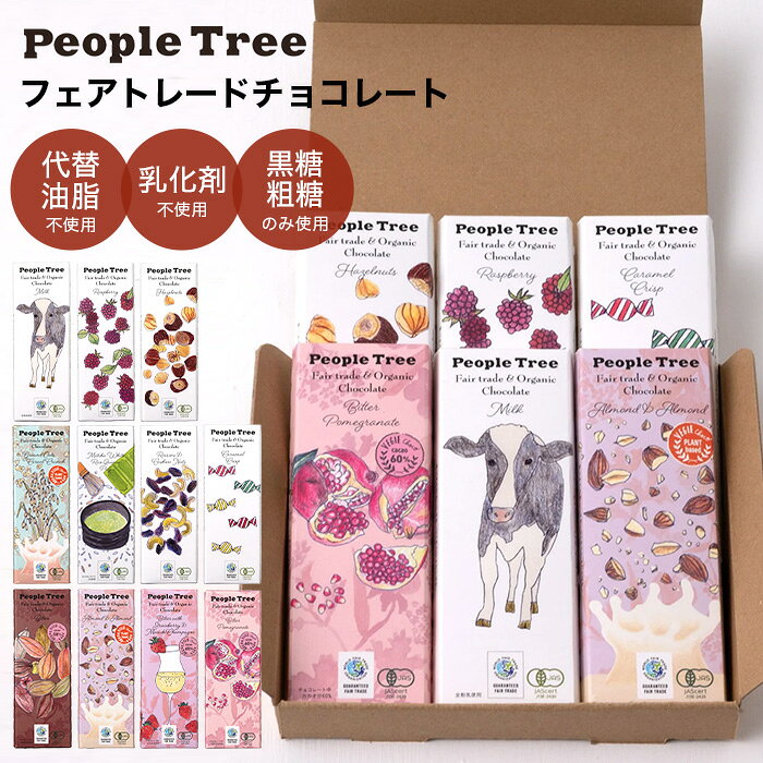 秋冬限定フェアトレードチョコ。シンプルで飽きのこないおいしさ。 スイス産のミルクを使った口あたりまろやかなチョコは子どもたちにも大人気! 黒糖ベースの看板チョコ。 オリジナルギフトボックス(153x143x23mm)に入れてお届けします。 S P E C 種類 ミルク、ラズベリー、ヘーゼルナッツ、 カラメルクリスプ、レーズン&カシューナッツ、抹茶ホワイトライスキノアパフ、 ビター、ビター・ザクロ、ビターウィズストロベリー&マール・ド・シャンパーニュ、 グランドオーツ・シリアルクランチ、アーモンド&アーモンド 内容量 50g (抹茶ホワイトは45g、ビターウィズストロベリーは40g) ※保存上の注意※ ・開封後はお早めにお召し上がりください。 ・温度変化により油脂分が白く固まることがあります。 召し上がっても差しつかえありませんが、風味が損なわれることがあります。 ●原産国 スイス ●WFTO製品ラベル ●SPA2017 国際部門 大賞受賞 ●有機JAS認証 ●EUオーガニック 画像提供:PeopleTree ※国際配送の場合は、別途送料がかかります。 【おいしいチョコが笑顔をつなぐ】 つくる人もしあわせになる フェアトレード&オーガニックチョコレート ピープルツリーのチョコは、有機栽培に力を入れている生産者団体が育てたカカオ豆を使用しています。 心を込めてつくった農作物を、ふさわしい値段で買い取ることによって日々の生活を支え、つくり手の健康や環境を守り、教育支援などのサポートをしています。 ピープルツリーのチョコには、中南米をはじめ、世界中の小規模農家が豊かな自然の中、笑顔で育てたフェアトレードのカカオ・黒糖・粗糖を使っています。幸せな気持ちを運ぶチョコ。 つくる人も幸せになれるものを選びたいものですね。 気候に左右されやすいカカオ豆を栽培する小規模農家は、不安定な収穫量や変動の激しい国際価格に悩まされています。そこでフェアトレードの取り組みとして、カカオ豆に正当な対価を支払うことで生産者の生活が成り立つよう配慮し、大部分の生産者に30%〜50%の代金を前払いして、農家の人々が金利の高い現地のローンに頼らずに自立できるよう支援しています。 また、輸入作物のみに限らず自給作物も合わせて栽培できる多様性のある農業や、農薬や化学肥料を使わない有機農法促進のため、農家の人々と長期的なパートナー関係を結んでいます。仕事の機会を提供することで、貧しい人々が自らの力で暮らしを向上させることを支援しています。 ピープルツリーがパートナーシップを組むカカオ豆と黒糖の生産団体のさまざまな具体的な支援状況をご紹介します。みなさんがフェアトレードチョコを選ぶことで、多くの生産者のみなさんが笑顔になっています。 ピープルツリーが取り組む各国での活動 - 生産者の状況 フィリピン オルタートレード 子どもたちに教育の機会、従業員の健康管理も万全に マスコバド黒砂糖の生産地。 売上高の70%は、ローン資金、多角化プロジェクト、トレーニングコースの形で生産者を直接支援するために使用されます。 そして、従業員の健康管理も徹底されるようになりました。また、サステナブルな農業の成功のおかげで子どもたちの教育の機会を得ることが可能となり、大学への進学という夢を叶えた農家も多くいます。 ドミニカ共和国 コナカド カカオ豆の品質向上のための研修や無料健康診断。 子どもたちのインターネット教育も支援 カカオの品質を改善するための研究・加工など技術トレーニングを行なっています。学校も建設され、貧しい家庭の生徒には奨学金が提供され、皆が教育を受けられるように。コンピュータールームも新設されて、インターネット教育の推進も。また、診療所での無料健康診断の実施、きれいな水プロジェクトが推進されて農家の人々の健康状態も改善されました。 パラグアイ共和国 マンドゥヴィラ 子どもたちの教育への手厚いサポート。 サッカーアカデミーも設立 フェアトレードの支援は、地元住民の教育と医療を特に大切にしています。 健康の教育、また廃棄物や寄生虫を適切に処理する方法をレクチャーしています。収入の少ない会員には、無料で治療や薬が提供されます。 子どもの学校教育に加えサッカーアカデミーを設立し、誰もがスポーツを楽しめる環境を整えています。 ペルー共和国 ノランディーノ、カクブラ 大人たちは生活意識に変化が見られ、ほとんどの子どもが高等教育を受けるように 生産者たちは学ぶ機会を得て、生活への考え方にも変化が見られました。 すべての生産者が毎年無料で健康診断も受け、 家を住みやすく改装し、子どもたちを学校に通わせることができるようになりました。 大学進学者も増え、子どもたちの多くは高等教育を受けるようになったので、子どもたちが将来より良い収入を確保する可能性が広がっています。 ボリビア共和国 エル・セイボ 医療保険制度や年金基金、子どもたちへの教育サポートで人生設計をバックアップ 組合メンバ