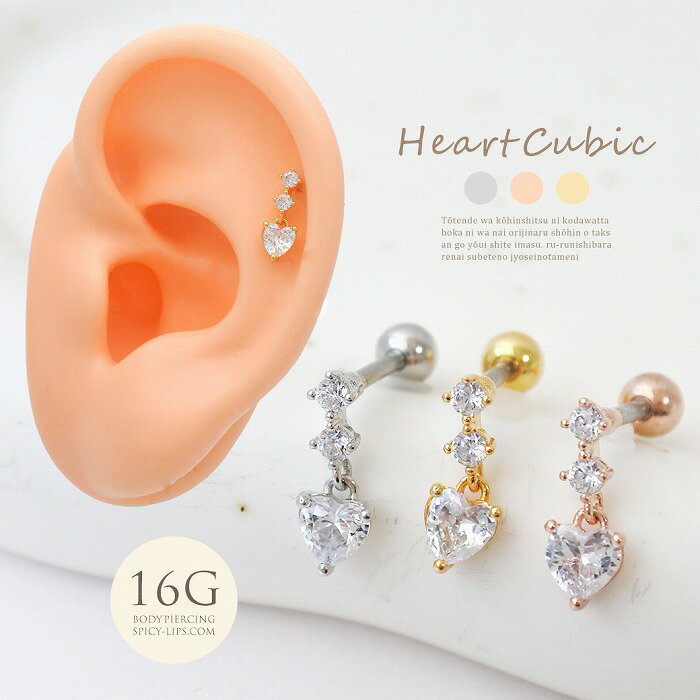 Detail Information 商品詳細 揺れる度に煌くハートジュエル 女性らしく上品に見えるのがポイント♪ 耳たぶにもとっても可愛いです。 サイズ 【ゲージ太さ】16G 【シャフト長さ】内径6mm 【ボールサイズ】4mm 【ジュエルサイズ】 《全長》約12mm 《ハート縦横》約4.5×4.5mm 素材 【シャフト部分】 高品質サージカルステンレス316L GOLDコーティング 【ジュエル部分】 メッキ ご注意 ・片耳1点の価格となります。両耳でお使いいただく場合は2点お買い求めくださいませ。 ・アレルギーの反応等、その時の体調や個人差がございますので、 初めてご使用の場合は必ずパッチテストをしてご使用下さい。 ・サイズって?素材って? ボディピアス基礎知識はこちらから 【モチーフカラー】クリア系/ 【ベースカラー】シルバー/ゴールド/ピンクゴールドPINKGOLD/ 【特集】ピンクゴールドC/キュービックジルコニア/一体化/ 関連キーワードボディピアス 軟骨ピアス へそピアス スパイシーリップス SPICYLIPS ボディピアス専門店 ブランド ピアス ボディピ ボディーピアス 14G 16G 18G 22G サージカルステンレス 金属アレルギー 金属アレルギー対応 部位 トラガス ヘリックス インナーコンク アウターコンク ロブ アンテナ 透明ピアス ピアッサー jps ストレートバーベル サーキュラーバーベル バナナバーベル ラブレットスタッド キャプティブビーズリング CBR セグメントリング スパイラルバーベル カスタマイズ カスタム インダストリアル 消毒 つけっぱなし シルバー ゴールド おしゃれ メンズ セカンドピアス 1,390円 税込 送料別 カードOK レビュー12件 SPICYLIPS ![]() | ||