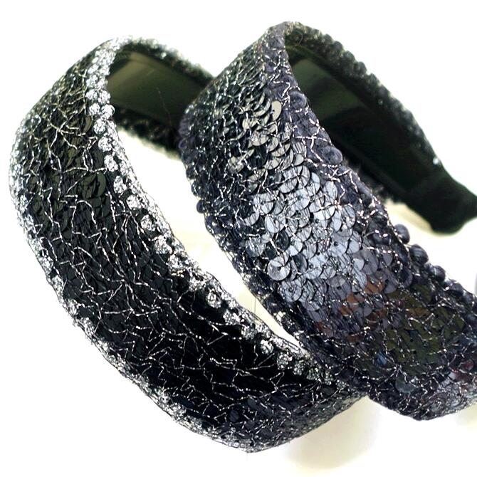 幅広カチューシャ。 両サイドのくし歯で髪をしっかりおさえつつ、ゴージャスに! 両端を少し残してワイドにスパンコールをあしらったデザイン。 極細の銀糸と黒糸でスパンコールを押さえつつ、メッシュ風に模様を描いています。 土台はプラスチック。 【色】(左から) ブラックxシルバー、ネイビーグレー(角度によってはシルバーっぽく見えます) 【サイズ】 幅 約 4 cm ※ メール便不可× 。*・。*・ 類似品はコチラ 。*・。*・ 。*・。*・。*・。*・。*・。*・。*・.:*~*☆ キラキラ華やか 巾広カチューシャ ☆*~*:. 1,210円 税込 送料別 カードOK 美美波”viviva-beauty&accessory ![]() | ||