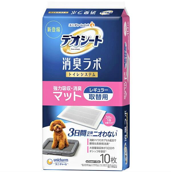 デオシート 消臭ラボトイレシステム 強力吸収・消臭マット レギュラー取替用 消臭マイクロカプセル配合で瞬間&長時間消臭 大容量吸収体が3日分のオシッコを吸収 ※愛犬1頭(体重4kg以下)の尿吸収時。ウンチをした場合は早く取り除いてください。 普段の生活での消費者テストにて「3日間マットがニオわない」と回答した消費者87.9% 閉鎖空間にて1日1回20ccの犬尿を滴下した後での3日後の臭気判定士による臭気強度・快・不快度評価の実施、 また、20ccの犬尿を滴下した後の3日後のアンモニア濃度評価を実施 ユニ・チャーム調べ 【原材料】 製品素材:綿状パルプ、高分子吸水材、ポリエチレンフィルム、吸水紙、ホットメルト接着剤、香料入り消臭マイクロカプセル 1,188円 税込 送料別 カードOK PET World アミーゴ楽天市場店 ![]() | ||