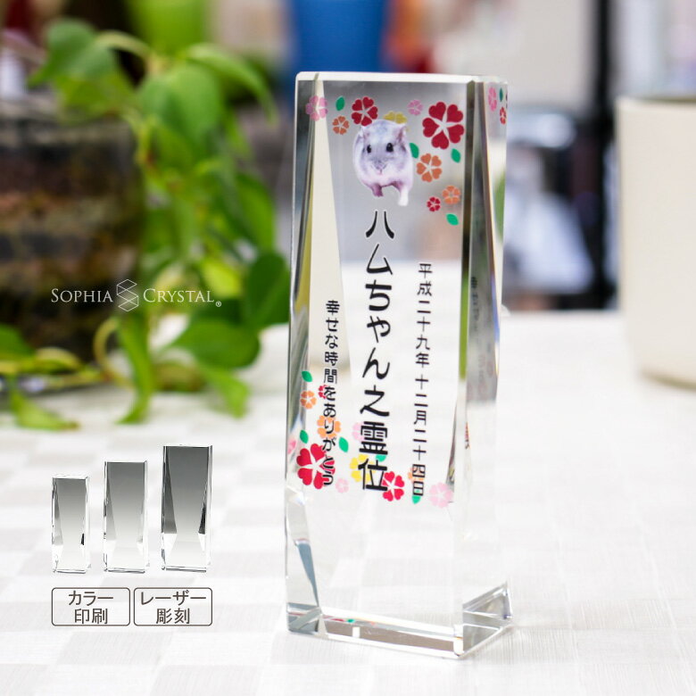 ウェルカム記念・お誕生日・その他記念に心に残るペットメモリアルをお作りしませんか? ペットという枠を越えて“家族”として暮らしているという方々も多くいます。 これから飼いはじめるご家族、すでに飼っているご家族の方々。思い出作りのお手伝いをさせてください。 またそのペットが亡くなった際には、人間と同じように供養したいと思うご家族が増えています。愛情が深ければ自然と思うものです。 ソフィアクリスタルのペットメモリアルは生前の元気な頃のお写真をクリスタルガラスに加工し手元供養をお作りします。 こちらはクリスタルペットメモリアル KP-32【中サイズ(B)】の商品ページです。 ●サイズ違いの商品ページはこちらです↓↓↓ ●おすすめのクリスタル仏具です↓↓↓ ●その他、ペットメモリアル一覧↓↓↓ 【ガラスについて】 ガラス・クリスタル製品は材料の特質上、内部に小さな気泡や不純物が見られる場合がございます。 また、素材その物の成型時に、研磨あと、筋、気泡による穴、カケなどが発生いたします。 透明度の高い美しいガラス・クリスタルを作るために致し方ないものとしてご了承いただきますようお願い申し上げます。 説 明 側面のダイヤカットがキラキラと優しく光を反射させる、オーバル形のクリスタルペットメモリアルです。台座の底面にホログラム加工を施しているので角度により虹色に輝きます。ペットちゃんのお写真をフルカラー印刷または2Dレーザー加工いたします。ガラスの透明感、カットの美しさなどご満足いただけるはずです! 加工無料、さらにラインストーンも1粒無料で装飾いたします。 材 質 エコロジークリスタルガラス サイズ 【特小】高さ10.5cm x 幅6cm x 奥行3cm 【小】高さ13cm x 幅7cm x 奥行3cm 【中】高さ17cm x 幅9.5cm x 奥行4cm←このページの商品はこちらです。 【大】高さ19.5cm x 幅11cm x 奥行4cm 包 装 化粧箱入り 用 途 ペット、ペット位牌、仏具、供養、葬儀、メモリアル いつまでも心に生きる大切な家族のための美しいお位牌をお作りします。 ※価格に含まれるもの (商品代金・校正代金・彫刻代金) (ロゴマークなど別途データを作成する必要がある場合には別途費用がかかる場合がございます。) 19,360円 税込 送料込 カードOK レビュー2件 名入れギフト専門店SophiaCrystal ![]() | ||