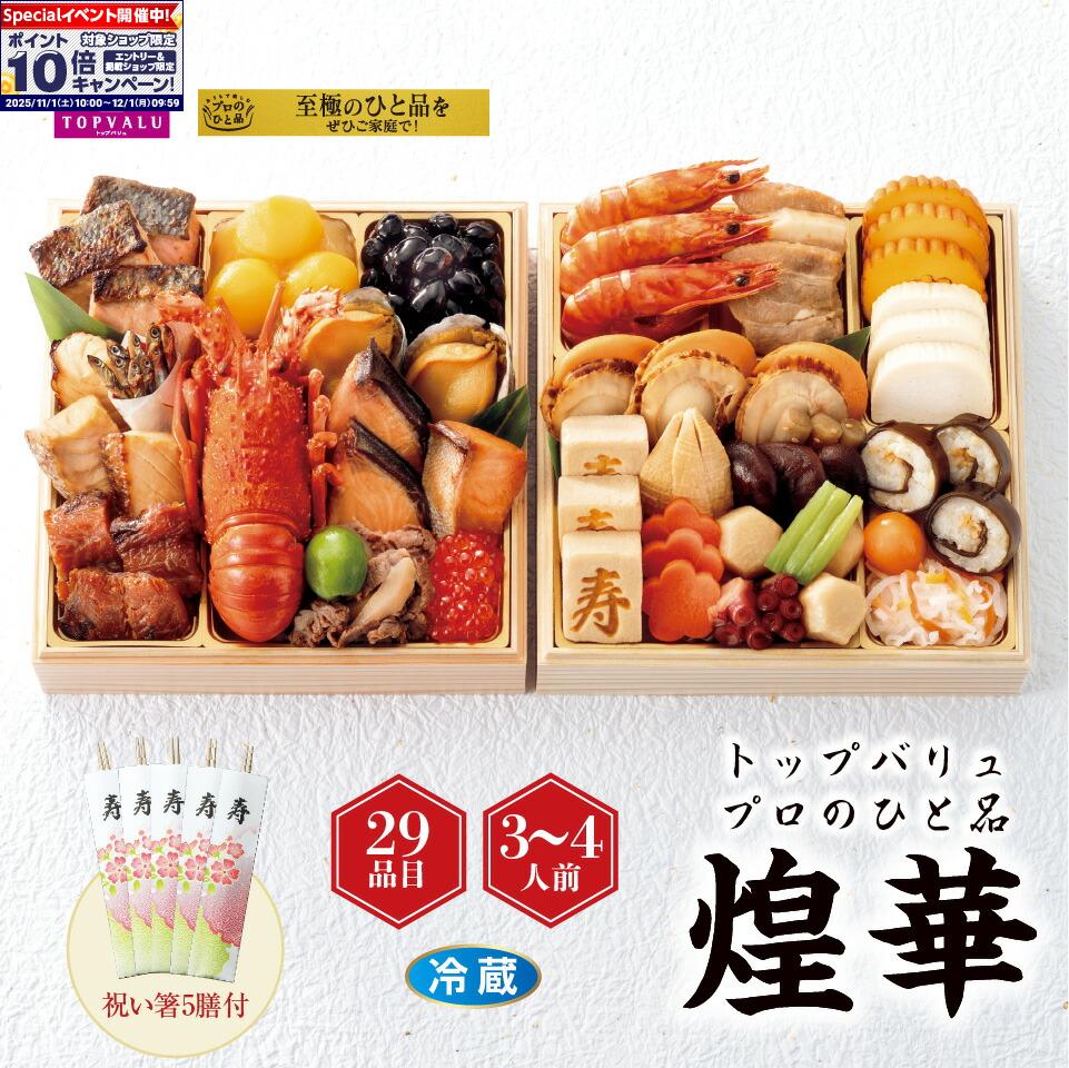 【おせち早得】トップバリュ プロのひと品「橋本料理長監修」和風二段重「煌華」[冷蔵]3−4人前[新しい年を、笑顔で囲むおせち]【早得予約は11/28(金) 18時まで】※早得期間終了後は、本体価格29,800円(税込32,184円)となります。和の美味をふんだんに詰合せたこだわりの二段重。素材本来の持ち味を大切に仕上げました。●特定原材料:えび、卵、小麦●温度帯:冷蔵●消費期限:2026年1月2日※商品のお届け・注意点について こちらの商品のお届け日は、2025年12月31日(水)のお届けです。 変更・キャンセルは承り日の最終日3日前までとなります お届け日・時間のご指定は承ることができません 「のし」・メッセージ等はお付けできません。 こちらの商品は送料込みです。 あらかじめご了承下さい。※画像はイメージです。2 30,574円 税込 送料込 カードOK マックスバリュ東海楽天市場店 ![]() | ||