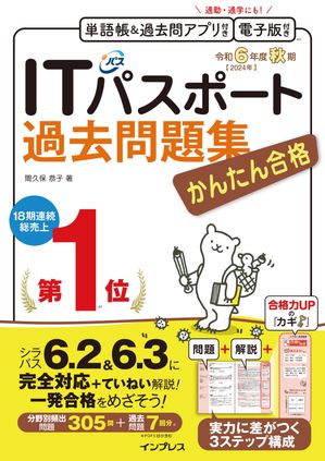<p>[この電子書籍は固定型レイアウトです。リフロー型と異なりビューア機能が制限されます]固定型レイアウトはページを画像化した構造であるため、ページの拡大縮小を除く機能は利用できません。また、モノクロ表示の端末ではカラーページ部分で一部見づらい場合があります。</p> <p><strong>最新シラバス6.2&6.3に完全対応!</strong><br /> <strong>ず〜っと売上ナンバー1! 信頼と実績の過去問題集で最短合格しよう!</strong></p> <p>ITパスポート試験合格を<strong>最短で目指す人</strong>は必携の1冊!<br /> 正答はもちろんのこと、誤答の選択肢についてもていねいに説明されているので、深く理解して幅広く習得できる!<strong>教科書並みの親切でわかりやすい解説</strong>で、<strong>受験直前までの仕上げ学習までガッチリサポート!</strong></p> <p><strong>【7年分の過去問】</strong>&<strong>【分野別!よく出る問題】<strong>で</strong>効率よく合格力をアップ!</strong></p> <p><strong>■最新シラバスに完全対応 ■</strong><br /> ・2023年12月に公開された<strong>新シラバス6.3</strong>にも完全対応!2024年10月以降に受験する人の学習にもしっかり対応しています!<br /> ・高校の授業「情報1」にシラバスが対応することで追加された重要用語は、<strong>巻頭付録「覚えておきたい!新しい用語」<strong>として収録!<br /> ・自分で書き込んで覚えられる</strong>巻頭付録「まとめノート」<strong>を収録!<br /> ・</strong>「擬似言語問題」の解説</strong>付き!</p> <p>■購入者限定特典■<br /> ・スマホで学べる単語帳!<strong>【でる語句200】&【シラバス5.0/6.0単語帳】+【過去問アプリ】</strong><br /> ・スマホ/タブレット/PCに入れて持ち運べる!<strong>本書の「全文 電子版」(PDFファイル)</strong>・インプレスのITパスポート受験者応援サイト「<strong>チャレンジ!ITパスポート</strong>」も使える!</p>画面が切り替わりますので、しばらくお待ち下さい。 ※ご購入は、楽天kobo商品ページからお願いします。※切り替わらない場合は、こちら をクリックして下さい。 ※このページからは注文できません。 1,408円 税込 送料込 カードOK 楽天Kobo電子書籍ストア ![]() | ||