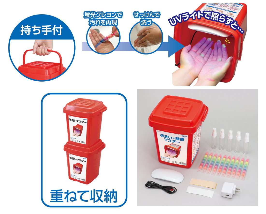 2174. 手洗い・除菌マスター 手洗い指導マニュアル付き 洗い残しが一目でわかる手洗いチェックセット!手洗い指導マニュアル付き!蛍光クレヨンで汚れを再現し、その後せっけんで手を洗います。UVライトで照らすと洗い残しが光るので、こどもの手洗い指導に最適です。アルコールを入れられるスプレー容器もついているので、除菌指導も可能です。(スプレー容器の中には何も入っていません)持ち手付きで、重ねて収納も可能です。 BOXサイズ:216×242×213mm セット内容:UVライト×1、蛍光クレヨン(6色)×10、USB充電ア... 8,600円 税込 送料別 カードOK 工具のお店 モンジュSHOP ![]() | ||