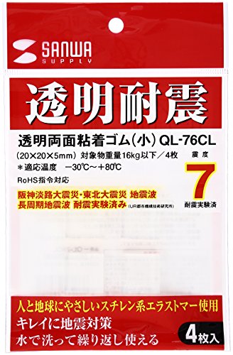 非難燃性クリア/1) 小/QL-76CL・Color:クリアSize:1) 小Style:非難燃性・パッケージ個数:1・無色透明なスチレン系エラストマー素材の耐震ジェルで、キレイに地震対策・【耐震度】:7・【サイズ】:W20×D20×H5mm(1枚あたり)・【対象物重量】:16kg以下/4枚・【適応温度】:-30℃~+80℃無色透明なスチレン系エラストマー素材の耐震ジェルで、キレイに地震対策 ・無色透明な耐震ジェルで、設置後も目立ちません。 ・使用する機器の底に貼り付けるだけの簡単設置です。 ・汚れた場合は水で洗うことで、繰り返し使用が可能です。 ・人と地球にやさしいスチレン系エラストマー素材を使用しています。 【耐震度】:7 【対象物重量】:16kg以下/4枚 【難燃仕様】:× 【ノンブリード仕様】:× 【適応温度】:-30℃~+80℃ 【サイズ】:W20×D20×H5mm 【入り数】:4枚 【原材料名】:スチレン系エラストマー 【耐用年数】:約5年(使用環境によって異なります。) *東日本大震災・阪神淡路大震災・長周期地震波 耐震実験済み ご使用方法 1.設置面の汚れを十分に取ってください。 2.設置機器に当製品のビニールを剥がして貼ります。 この際、耐震性は当製品と接している面積が大きい程、高くなります。 3.耐震性は単純に機器の重量だけでなく、形状・重心・設置面の素材(設置面の素材により粘着力が変わる為)等により決まりますので、耐震性を高める為には出来るだけ設置面の広い面積で当製品をお使い下さい。 4.設置したい場所に置き、ゆっくり押さえつけます。 5.剥がす際は、端をつまみゆっくり剥がしてください。剥がしずらい場合は、隙間に少しずつ水をつけながら剥がすと、楽に剥がせます。 ※注意事項※ ・当製品は地震や衝撃による破損を少なくするものであり、災害や事故等をするものではありません。 ・漆塗りやニス塗り等、デリケートな設置面へのご使用を避けて下さい。 ・当製品は両面テープではありませんので、壁面に固定したり、物を吊り下げたりしないで下さい。 ・当製品は子供の手の届かない所で保管して下さい。 ・当製品は食べられません。 ・PPやテフロン加工された面など、一般の粘着テープにつきずらい面には粘着しません。 ・直射日光のあたらない室内でご使用下さい。 ・使用環境によっても異なりますが、5年を目安に交換することをお奨めします。 963円 税込 送料込 カードOK サトイチ商会 ![]() | ||
