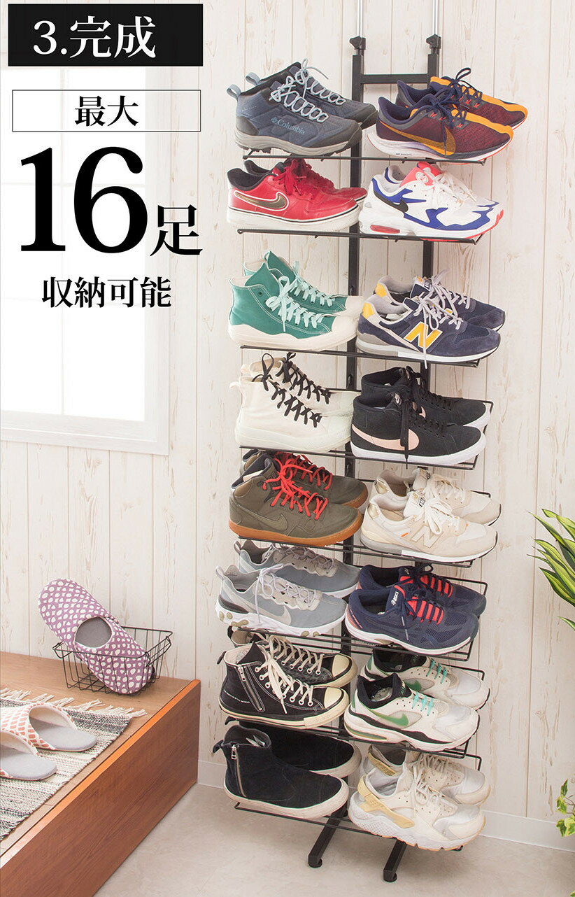 場所を取らずに、最大16足収納できます。玄関だけではなくリビングルームでディスプレイラックとしてショップのように観て楽しむが実現できます。突っ張り式なので安定性も抜群。ワイヤー棚の角度は20度の傾斜なのでスニーカーがよく見える角度で取り出しやすくなってります。お客様組み立て式。幅50×奥行31×高さ194-264cm。素材フレームスチール(粉体塗装)。棚スチールスニーカー コレクションのディスプレイに。 23,454円 税込 送料込 カードOK ヒマラヤネット〜家具&インテリア ![]() | ||