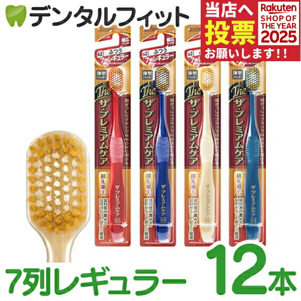 ザ・プレミアムケアハブラシ 7列レギュラー 濃密65穴の歯ブラシ! 毛束を密集させて配列しているため、歯と歯ぐきをやさしく包み込んで、しっかりと磨きあげます。 個装サイズ 38×230×20mm 個装重量 約20g 内容量 12本 製造国 日本 柄の材質 本体部:ポリプロピレン ラバー部:SEBS 毛の材質 飽和ポリエステル樹 毛のかたさ ふつう 耐熱温度 80度 カラー ゴールド・ワインレッド・ロイヤルブルー・パープル ※色はお選びいただけません。【ご注意(免責)事項】当店では、サイト上に最新の商品情報を掲載するよう努めておりますが、メーカーの都合等により、商品規格や仕様(容量・成分・パッケージ・原産国など)が予告なく変更される場合がございます。このため、実際にお届けする商品と商品ページ上の情報表記が異なる場合がございますので、ご使用前には必ずお届けした商品の商品ラベルや注意書きをご確認ください。また、商品情報についてページ表記以外の詳細が必要な場合は、メーカー等にお問合せください。 5,256円 税込 送料別 カードOK レビュー2件 歯科医院専売品のデンタルフィット ![]() | ||