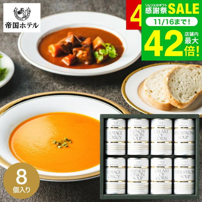 商品説明 世界中の賓客をもてなしてきた帝国ホテル伝統の味を丹精込めて仕上げた本格的な味わいのスープディナーセットです。帝国ホテルにて長年培った技術で作り上げた味わい豊かな野菜スープはどれも妥協のない至極の味わい。伝統の味をお手軽な缶タイプでご家庭にお届けします。 商品詳細 帝国ホテル スープ缶詰セット SPEC ●コーンのクリームスープ160g×2、フレンチオニオンスープ160g×2、ミネストロンスープ160g×2、ポタージュクレシー(人参のスープ)160g×2(すべて缶) ●箱... 4,320円 税込 送料込 カードOK レビュー11件 ソムリエ@ギフト ![]() | ||