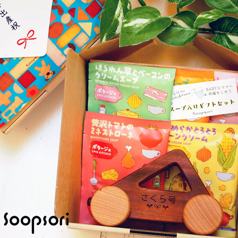 朝食や昼食に添えて、小腹が空いたときのおやつに、お弁当のお供に、ささっと飲めてほっと一息つける、手軽で簡単1ミニッツスープ。お渡しにも気を遣わせない常温保存でギフトに気軽にご利用いただけます。 木のおもちゃとスープが入ったギフトセット お祝いやプチギフト、ちょっとしたお返しに スープの種類はランダムで5個(5種類)入ります。 クラフトのギフトボックス仕様 カード&包装紙つきでお届けします ・内祝のみ、下に記名可。必要事項は備考欄にご入力ください。 ・カードサイズ:6cm×6cm 赤ちゃん必須おもちゃ、自分で動かせる車おもちゃ 木の車は男の子、女の子問わず人気なアイテム。 小さなお子様の手に収まりやすいサイズです。 車おもちゃへの名入れ無料 ご注文時に刻印するイラストを選択し、刻印文字を入力してください。 どこを触ってもすべすべ赤ちゃんに優しい手触り 仕上げはEN71クリアの亜麻仁油のみ木のぬくもりが生きています 出産祝い、お返し、手土産など手軽に渡せて'いたわり'の思いを伝えるギフトセット。 BABYへのプレゼントにママへの「ゆっくり休んでね」の気持ちを添えるスープ入りプレゼントです。 可愛いパッケージのスープと赤ちゃん時におすすめの木のおもちゃでさりげないけど気の利いたギフトにおすすめです。 3,300円 税込 送料別 カードOK レビュー10件 木のおもちゃと子ども家具スプソリ ![]() | ||