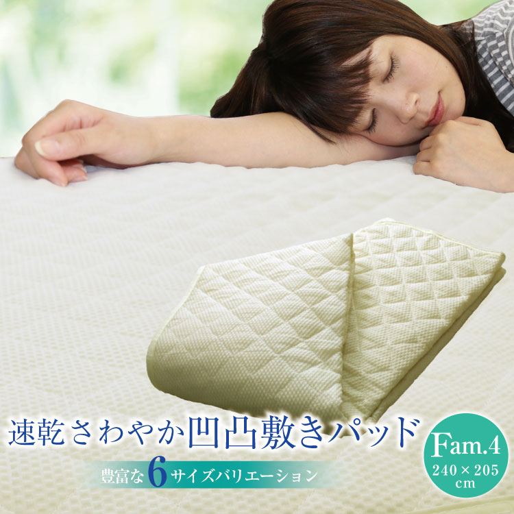 エンボス加工で爽やかな肌触り! 速乾さわやか敷パッド!速乾性があるのですぐに乾きます。凹凸素材が汗を素早く放出しムレにくく快適な寝空間を保ちます。◆家庭でお洗濯できますので、シーツの代わりにご利用ください。(お洗濯時には洗濯ネットをご利用ください)◆ロングサイズのベッドや敷き布団にもご利用になれます。◆四隅にゴムが付いているので、マットレス、敷き布団がずれにくく簡単にセットできます。(マットレスの厚さは約20cm位まで対応)※その他、「ご使用上の注意」や「お手入れ方法」は商品についた品質基準タグにてご確認下さいませ。 品質 側生地表地:ポリエステル80%、綿20%裏地:ポリエステル100%詰め物:ポリエステル100%《中国製》サイズ ファミリー4人用サイズ 約240×205cm(ロングサイズ対応)カラー クリーム色洗濯 ・洗濯可能(ネット使用)・乾燥機のご使用はお控えください。 【布屋商店の敷パッドについて】 当店は、2019年に創業200年を迎え、北陸地区に複数店舗を構える、信頼と実績の寝具店でございます。 当店が取り扱っております敷パッドは、日本を代表する寝具ブランド(京都西川、西川リビング、昭和西川)の高級敷パッドから、お手頃価格のベッドパッドまでの豊富な品揃えです。 シングル、セミダブル、ダブル、クイーンなどのサイズはもちろんのこと、他店では取り扱いの少ないベビー、ジュニア、ファミリーサイズなどもご用意しております。 秋冬物としては、やわらか暖かな遠赤素材入りやフランネル・エステルをはじめ、シルク・麻・新疆綿など高級天然素材の敷パッドなど種類豊富な品揃えです。 春夏物は丸洗いOKのリップル加工・エンボス加工素材をはじめ、接触冷感素材のクールで快適な敷パッドを各種 取り揃えております。 またアレルギー対応素材の帝人製ウォシュロンやインビスタ社ホロフィルを使った洗えるベッドパッドなど圧倒的な品揃えとお買い得価格商品が満載です。 より暖かく、より快適な睡眠であなたの健康のお手伝いが出来れば幸いでございます。 また、敷パッド以外にも、羽毛布団・敷布団・掛布団・毛布・枕・カバー類など各種寝具を取り揃えておりますので 是非ごゆっくりと店内をお買い回りくださいませ。このページの商品番号は8169fです。 ▼綿100% ダブルガーゼ敷きパッドはこちら!▼ ダブルガーゼ敷きパッドファミリー4人用 240×205cm 綿100% アイボリー ベージュ2重ガーゼ オールシーズン 洗える 価格:4,460円 3,777円 税込 送料別 カードOK レビュー4件 超寝具店ヌノヤ楽天市場店 ![]() | ||