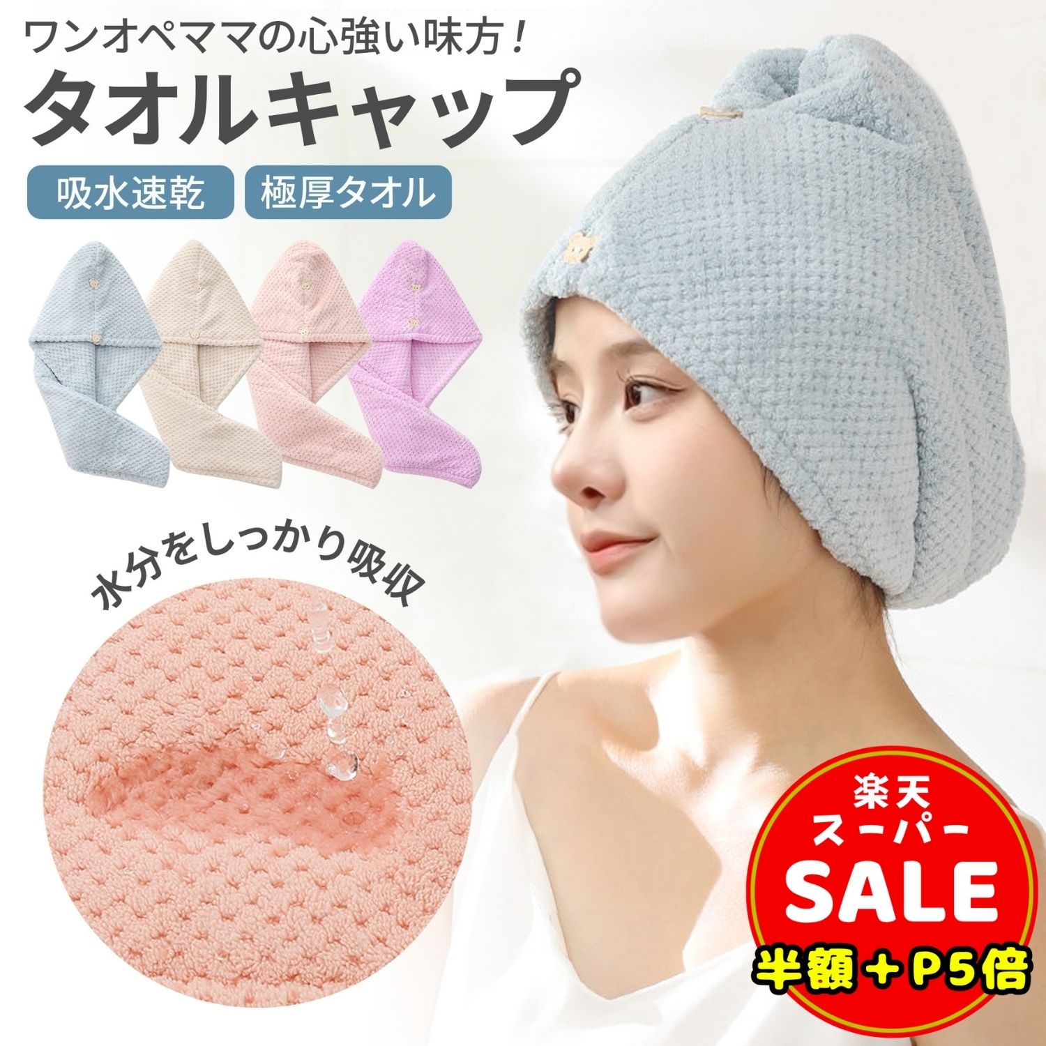 [商品説明] うさぎとくまのかわいいヘアキャップ2点セット! うさぎの耳とクマの耳のかわいいヘアキャップタオル かぶるだけでCUTEです。 ★瞬間吸収 吸収性抜群のヘアキャップタオル 入浴時や洗顔時に髪をまとめるのにも便利 マイクロファイバーだからしっかり吸水、嬉しい速乾! 吸水力は綿の約3倍です! ★お肌に優しい心地よい質感 ふわふわ、もこもこの手触りが気持ちいい 思わずすりすりしたくなるパイル生地です。 ★豊富なカラーバリエーション 7色から選べます。 ベージュ ピンク ブルー パープル グリーン ブラウン グレー 濡れても色落ちの心配なし、 お洗濯でも他の素材に色移りしません。 ★さまざまなシーンで お風呂上がりやプールの後も大活躍 メイク落とし、洗顔、温泉や旅行にも ★さっとかぶるだけでタオルドライ 夏場のドライヤーは暑くて早く終わらせたい方、 柔らかな素材が水分をしっかり吸収するので時短で楽ちん! 冬場の湯冷め防止にも! ドライヤーの時間を短くすることで、摩擦や熱風による髪のダメージも軽減、 髪を優しく守りながら水を吸ってくれて、素早く乾きます。 伸縮性があるので、子供から大人まで幅広くお使い頂けます。 【商品情報】 名 称:ヘアキャップタオル 内 容:うさぎ・くまの2点セット サイズ:30cm×25m(うさぎ) 25cm×20m(くま) 重 量:約60g(うさぎ) 約50g(くま) カラー:7色から選べます ベージュ ピンク ブルー パープル グリーン ブラウン グレー 材 質:ポリエステル84.5%、ナイロン15.5% メーカー希望小売価格はメーカーカタログに基づいて掲載しています 950円 税込 送料込 カードOK レビュー51件 買い物天国 ![]() | ||