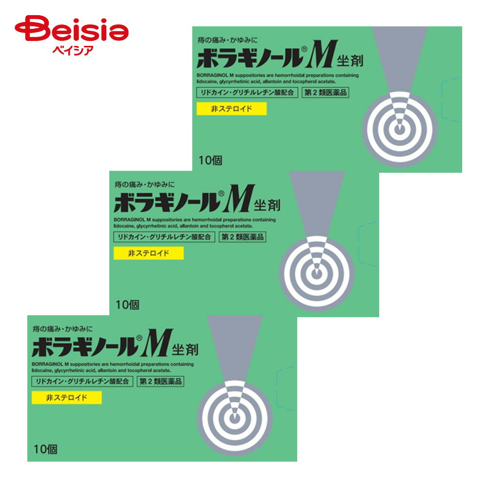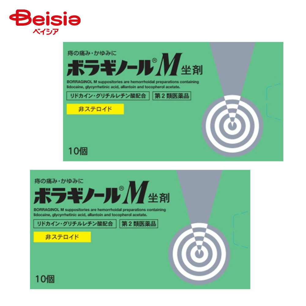 【注意】こちらの商品は医薬品です。 ※医薬品は使用上の注意をよく読み、用法・用量を守って正しくお使いください。 医薬品説明 薬品名 ボラギノールM坐剤 10個 作用と特徴 1.4種の成分がはたらいて、痔による痛み・かゆみにすぐれた効果を発揮します。●リドカインが痛み、かゆみをしずめます。グリチルレチン酸が炎症をやわらげ、痔の症状の緩和をたすけます。●アラントインが傷の治りをたすけ組織を修復するとともに、ビタミンE酢酸エステルが血液循環を改善し、痔の症状の緩和をたすけます。2.効果の発現をよくするため、体温ですみやかに溶ける油脂性基剤を用いて患部に直接作用するよう製剤設計しています。●刺激が少なく挿入しやすい油脂性基剤が傷ついた患部を保護し、スムーズな排便をたすけます。●アルミシートに入った白色-わずかに黄みをおびた白色の坐剤です。リドカイン 鎮痛・鎮痒作用グリチルレチン酸 抗炎症作用アラントイン 組織修復作用ビタミンE酢酸エステル 血液循環改善作用→痔の症状を改善(痛み・かゆみに) 内容量 10個 効能・効果 いぼ痔・きれ痔(さけ痔)の痛み・かゆみの緩和 用法・用量 被包を除き、次の量を肛門内に挿入すること。年齢・・・1回量・・・1日使用回数成人(15歳以上)・・・1個・・・1-2回15歳未満・・・使用しないこと坐剤の取り出し方・挿入法排便後、入浴後、あるいは寝る前の挿入が効果的です1.アルミシートから1個を切りはなしてください。2.アルミシートの上部を1枚ずつ両手でつまんでください。3.そのまま左右に開いて坐剤を取り出してください。4.坐剤の底を持ち、先の方から坐剤が全部肛門内に入るまで、指で十分に押し込んでください。※アルミシートで手指等を傷つけないようご注意ください。<用法・用量に関連する注意>(1)坐剤が軟らかい場合には、しばらく冷やした後に使用すること。 寒い時期や低温での保管により坐剤表面が硬くなりすぎた場合は、手であたため 表面をなめらかにした後に使用すること。(2)肛門にのみ使用すること。(3)用法・用量を厳守すること。 成分・成分量 1個(1.75g)中成分・・・含量・・・はたらきリドカイン・・・60mg・・・局所の痛み、かゆみをしずめます。グリチルレチン酸・・・30mg・・・炎症をやわらげます。アラントイン・・・20mg・・・傷の治りをたすけ、組織を修復します。ビタミンE酢酸エステル(トコフェロール酢酸エステル)・・・50mg・・・末梢の血液循環をよくし、うっ血の改善をたすけます。添加物:ハードファット リスク分類 第2類医薬品 使用上の注意 ■■してはいけないこと■■(守らないと現在の症状が悪化したり、副作用が起こりやすくなる)1.次の人は使用しないこと 本剤または本剤の成分によりアレルギー症状を起こしたことがある人。2.長期連用しないこと■■相談すること■■1.次の人は使用前に医師、薬剤師または登録販売者に相談すること (1)医師の治療を受けている人。 (2)妊婦または妊娠していると思われる人。 (3)高齢者。 (4)薬などによりアレルギー症状を起こしたことがある人。 (5)むくみのある人。 (6)腎臓病、高血圧、心臓病の診断を受けた人。2.使用後、次の症状があらわれた場合は副作用の可能性があるので、直ちに使用を中止し、 この文書を持って医師、薬剤師または登録販売者に相談すること 関係部位・・・症状 皮膚・・・発疹・発赤、かゆみ、はれ その他・・・刺激感 まれに下記の重篤な症状が起こることがある。 その場合は直ちに医師の診療を受けること。 症状の名称・・・症状 ショック(アナフィラキシー)・・・使用後すぐに、皮膚のかゆみ、じんましん、 声のかすれ、くしゃみ、のどのかゆみ、息苦しさ、動悸、意識の混濁等があらわれる。 偽アルドステロン症、ミオパチー・・・手足のだるさ、しびれ、つっぱり感や こわばりに加えて、脱力感、筋肉痛があらわれ、徐々に強くなる。3.10日間位使用しても症状がよくならない場合は使用を中止し、この文書を持って医師、 薬剤師または登録販売者に相談すること 保管および取扱い上の注意 (1)本剤は、1-30℃で保管すること。 ・体温で溶けるように設計されているので、直射日光の当たらない涼しい所に 保管すること。 ・開封後も坐剤の先を下に向けて外箱に入れ、マークのとおり立てた状態で保管 すること。(2)0℃以下での保管はさけること(ひび割れを生じる場合がある)。(3)小児の手の届かない所に保管すること。(4)他の容器に入れ替えないこと(誤用の原因になったり品質が変わる)。(5)使用期限を過ぎた製品は使用しないこと。(6)本剤挿入後、溶けた坐剤が漏れて衣類などに付着すると取れにくくなることがある ので注意すること。[その他の添付文書記載内容]挿入後の注意1.坐剤が外に出ないよう挿入直後の激しい運動はなるべく避けるようにしてください。2.挿入後、異物感が残ることがありますが、坐剤が溶けるにしたがってなくなっていきます。3.挿入後の排便時に油のようなものが出ること