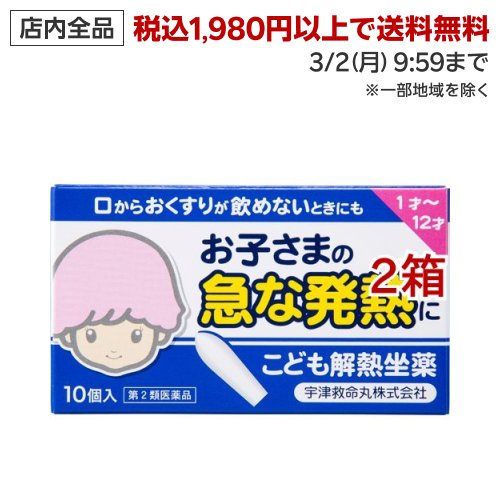お店TOP>医薬品>風邪薬>解熱鎮痛剤>解熱鎮痛剤 坐薬>こども解熱坐薬 キオリトル (10個入*2箱セット(セルフメディケーション税制対象))お一人様1セットまで。医薬品に関する注意文言【医薬品の使用期限】使用期限120日以上の商品を販売しております商品区分:第二類医薬品【こども解熱坐薬 キオリトルの商品詳細】●小さなお子さまにとって発熱は最も一般的なかぜの症状です。また、夜中や外出先で思いがけない時に熱を出したりします。●キオリトルは、この様な時のお子さまの熱を効果的に下げ、しかも胃への負担が少ないお薬です。●吐き気があったり、咳き込んだりしてクスリが飲めない時にも適しています。●販売名:キオリトル【効能 効果】小児の発熱時の一時的な解熱【用法 用量】次の量を、肛門内に挿入してください。1才未満:使用しないこと1才〜2才:1日使用回数 1回、1回使用量 1/2〜1個3才〜5才:1日使用回数 1回、1回使用量 1個6才〜12才:1日使用回数 1回、1回使用量 1〜2個(1)本剤の使用は1日1回とし、2日続けて使用しないでください。(2)定められた用法及び用量を厳守してください。(3)小児に使用させる場合には、保護者の指導監督のもとに使用させてください。(4)肛門にのみ使用し、内服しないでください。【成分】1個(950mg)中(成分:分量:作用) アセトアミノフェン:100mg:熱を下げます添加物として、ハードファットを含有します。【注意事項】本剤は小児用ですが、解熱薬に定められた注意事項として成人が使用される際のことも記載しております。★使用上の注意・してはいけないこと(守らないと現在の症状が悪化したり、副作用・事故が起こりやすくなります。)1.次の人は使用しないでください。(1)本剤又は本剤の成分によりアレルギー症状を起こしたことがある人。(2)本剤又は他の解熱鎮痛薬、かぜ薬を使用してぜんそくを起こしたことがある人。2.本剤を使用している間は、次のいずれの医薬品も使用しないでください。他の解熱鎮痛薬、かぜ薬、鎮静薬3.使用前後は飲酒しないでください。4.長期連用しないでください。・相談すること1.次の人は使用前に医師、歯科医師、薬剤師又は登録販売者に相談してください。(1)医師又は歯科医師の治療を受けている人。(2)妊婦又は妊娠していると思われる人。(3)高齢者。(4)薬などによりアレルギー症状を起こしたことがある人。(5)次の診断を受けた人。心臓病、肝臓病、腎臓病、胃・十二指腸潰瘍2.使用後、次の症状があらわれた場合は副作用の可能性があるので、直ちに使用を中止し、この文書を持って医師、薬剤師又は登録販売者に相談してください。(関係部位:症状)皮膚:発疹・発赤、かゆみ消化器:吐き気・嘔吐、食欲不振精神神経系:めまいその他:過度の体温低下まれに下記の重篤な症状が起こることがあります。その場合は直ちに医師の診療を受けてください。(症状の名称:症状)ショック(アナフィラキシー):使用後すぐに、皮膚のかゆみ、じんましん、声のかすれ、くしゃみ、のどのかゆみ、息苦しさ、動悸、意識の混濁等があらわれる。皮膚粘膜眼症候群(スティーブンス・ジョンソン症候群)、中毒性表皮壊死融解症、急性汎発性発疹性膿疱症:高熱、目の充血、目やに、唇のただれ、のどの痛み、皮膚の広範囲の発疹・発赤、赤くなった皮膚上に小さなブツブツ(小膿疱)が出る、全身がだるい、食欲がない等が持続したり、急激に悪化する。肝機能障害:発熱、かゆみ、発疹、黄疸(皮膚や白目が黄色くなる)、褐色尿、全身のだるさ、食欲不振等があらわれる。間質性肺炎:階段を上ったり、少し無理をしたりすると息切れがする・息苦しくなる、空せき、発熱等がみられ、これらが急にあらわれたり、持続したりする。ぜんそく:息をするときゼーゼー、ヒューヒューとなる、息苦しい等があらわれる。腎障害:尿量減少、発熱、発疹、全身のむくみ、全身のだるさ、関節痛(節々が痛む)、下痢等があらわれる。3.1回使用して症状がよくならない場合は使用を中止し、この文書を持って医師、歯科医師、薬剤師又は登録販売者に相談してください。★保管及び取扱い上の注意(1)直射日光の当たらない30度以下の涼しい所に、図のように坐薬の先端を下に向け、立てて保管してください。(2)小児の手の届かない所に保管してください。(3)他の容器に入れ替えないでください。(誤用の原因になったり品質が変わることがあります。)(4)使用期限を過ぎた製品は使用しないでください。【医薬品販売について】1.医薬品については、ギフトのご注文はお受けできません。2.医薬品の同一商品のご注文は、数量制限をさせていただいております。ご注文いただいた数量が、当社規定の制限を越えた場合には、薬剤師、登録販売者からご使用状況確認の連絡をさせていただきます。予めご了承ください。3.効能・効果、成分内容等をご確認いただくようお願いします。4.ご使用にあたっては、用法・用量を必ず、ご確認ください。5.医薬品のご使用については、商品の箱に記載または