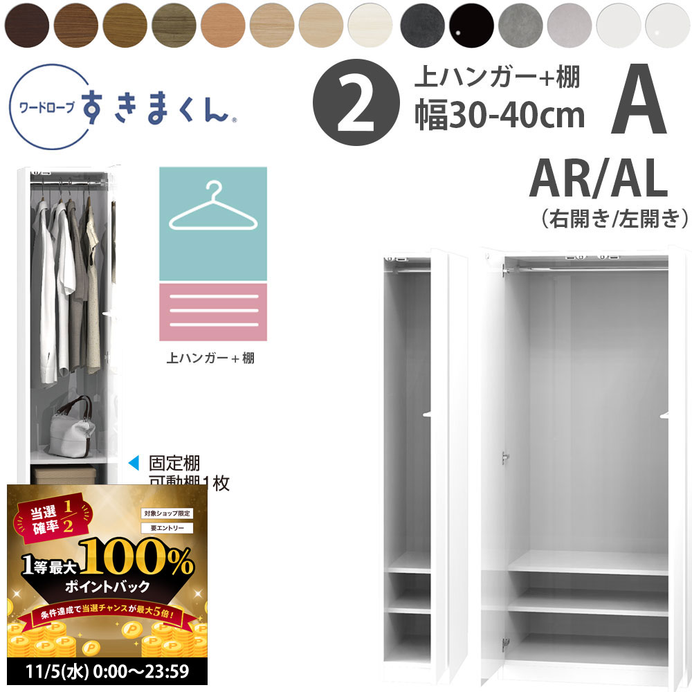 商品詳細 説明 幅は1単位でサイズオーダー可能。配置スペースにぴったりフィット。ワードローブすきまくんの最大の特長は、横幅を1単位でサイズオーダーできること。家具同士の無駄なスペースをなくして、フラットに収めることで、より開放的な住空間が生まれます。14種のアイテムを自由に組み合わせ。適材適所の収納術を完成。配置場所ごとに、「掛ける」「たたむ」「並べる」収納法を使い分けたいから。 上下ハンガー、ハンガー+棚、ハンガー+チェスト、棚のみ、チェストのみ、といった内部構成に加え、上置きやチェストの単体など全14種のアイテムをラインナップ。 扉形状も、左右の片開き、両開き、ミラー扉をご用意。使う人の目線で多彩に展開しています。 サイズ幅30-40×奥行56.5×高さ180.2cm 重量kgカラーカラーオーダー(全14色): ホワイト(艶有り) W、シルクベージュ(艶消) SB、モードグレイ(艶なし) MG、艶消しブラック(艶消)BB、モードブラック(艶なし) MB、マットホワイト(艶なし) MW、ホワイトシカモア木目(艶消) WS、ライトアッシュ木目(艶消し) LA、リトモナチュラル RN、ミディアムオーク木目(艶消し) M、グレイウォルナット木目(艶消し) GR、セピアウォルナット木目(艶消し) SP、ブラックウォルナット木目(艶消)、ダークオーク木目(艶消し) DB 主な材質 仕様 完成品 品質高い安全性のF☆☆☆☆(フォースター)を使用。シックハウス症候群などからのお客様の健康をお守りいたします。小さなお子様のいる家庭でも安心して使えます。 製造国 日本 付属品 備考 すきまくんシリーズはオーダーメイドの製品となるためキャンセルすることが出来ません。 サイズオーダーは木製品のため、1.5mm程度の誤差がございます。高さオーダーの測り方についてはこちら キーワード すきまくん 隙き間くん 隙間くん すき間くん すきま収納 隙間 セミオーダー オーダメード オーダメイド すきま くん ワードローブ チェスト洋服収納 衣服収納 ジャストフィット オーダーメイド 新生活 家具 インテリア 送料 本州、四国は送料無料*九州、北海道、沖縄、離島は追加送料がかかります。 配送 配送会社:アートセッティングデリバリー株式会社(家具おまかせ便) 配送ランク:D 開梱、設置、梱包材引き取りまで無料サービスです。 *エレベーターなしの3階以上、吊り上げは別途料金がかかります。必ず事前にご連絡ください。*搬入できずに返品となった場合は、往復の送料+再梱包費をご負担いただきます。搬入経路をご確認ください。淡路島は配送不可地域となっております。*淡路島は配送不可となります。 納期情報 買い物かご上に記載 配送日時指定 配送日時の希望は、備考欄にご記入ください。時間指定は、お届け地域により可能です。お届けの地域が時間指定可能かどうかは、こちらのページでご確認ください。 オプション 不要家具の有料引取りサービスはこちら関東地方限定のサービスとなります。配送会社、配送条件なども変更となります。 幅がサイズオーダーできるワードローブ(1)Wハンガー / (2)上ハンガー+棚 / (3)W下ハンガー+上下棚幅がサイズオーダーできるワードローブ(4)棚 / (5)ハンガー+チェスト / (6)棚+チェスト幅と高さがサイズオーダーできる上置き(7)上置きミラー扉のワードローブ(※サイズオーダーはできません。)(8)ミラー扉 Wハンガー / (9)ミラー扉 上ハンガー+棚 (10)ミラー扉 下ハンガー+上下棚 / (11)ミラー扉 棚幅がサイズオーダーできるチェスト(12)チェスト3段 / (13)チェスト4段 / (14)チェスト5段 52,800円 税込 送料別 カードOK レビュー1件 make space ![]() | ||