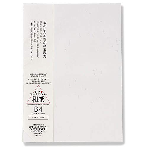 50枚・ B4 206050101・・Size:B4Style:50枚・紙厚:0.13~0.14mm・重さ:64g/m2・用途:お礼状、挨拶状、案内状、お品書き、メニュー用紙、掛け紙、ランチョンに・仕上げタイプ: つや仕上説明 ●挨拶状、礼状、招待状などビジネスレターとして。●メニュー用紙、ランチョンマット、掛け紙、席次表など、さまざまな用途にお使いいただけるプリンター用和紙です。●大礼紙はツヤのある繊維が入っているのが特徴です。●さまざまなプリンターで印刷ができ、ペン・毛筆にも対応。インク乗りも良く、写真やイラストも印刷しやすいです。●※パッケージ上面が印字面です。●※用紙にカールがある場合、印刷時に用紙詰まりや用紙が折れ曲がる原因になりますので、必ず直してからセットしてください。●※一度にセットできる枚数は用紙やプリンターの機種により異なります。紙送りがよくない時は、手差しで1枚ずつ給紙してください。●※紙粉はおさえてありますが、多量にプリントする際には、プリンターの掃除をこまめにしてください。●※用紙やプリンターの機種により濃度の差が生じることがあります。その場合にはプリンターの濃度設定などを調節してください。なお、大きな繊維部分に印字されますと、繊維に沿って多少インクがにじむことがあります。●※直射日光を避け、乾燥した場所に保管してください。●※包みに入れ、変形しない平らな状態で保管してください。 1,928円 税込 送料別 カードOK エブリデイ・ダイレクト ![]() | ||