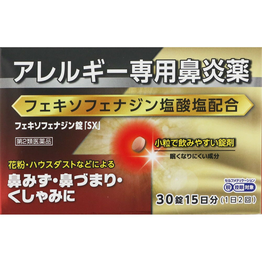 ■製品特徴 ●第2世代抗ヒスタミン成分 フェキソフェナジン塩酸塩が,花粉やハウスダストによる鼻みず,鼻づまり,くしゃみなどのつらいアレルギー症状に優れた効果を発揮します。 ●脳に影響を及ぼしにくいため,眠くなりにくいアレルギー専用鼻炎薬です。 ●「集中力,判断力,作業能率の低下」といった,気づきにくい能力ダウン(インペアード・パフォーマンス)も起こしにくいお薬です。 ●空腹時にも服用できます。 ●1回1錠,1日2回の服用で,効き目が1日続きます。 ※花粉などの季節性のアレルギー性鼻炎症状に使用する場合は,花粉飛散予測日から,又は,症状が出始めたら早めに服用を始めると効果的です。 ■使用上の注意 ■してはいけないこと■ (守らないと現在の症状が悪化したり,副作用・事故が起こりやすくなります。) 1.次の人は服用しないでください。 (1)本剤又は本剤の成分によりアレルギー症状を起こしたことがある人 (2)15才未満の小児 2.本剤を服用している間は,次のいずれの医薬品も使用しないでください。 他のアレルギー用薬(皮ふ疾患用薬,鼻炎用内服薬を含む),抗ヒスタミン剤を含有する内服薬等(かぜ薬,鎮咳去痰薬,乗物酔い薬,催眠鎮静薬等),制酸剤(水酸化アルミニウム・水酸化マグネシウム含有製剤),エリスロマイシン 3.服用前後は飲酒しないでください。 4.授乳中の人は本剤を服用しないか,本剤を服用する場合は授乳を避けてください。 (動物試験で乳汁中への移行が認められています。) ▲相談すること▲ 1.次の人は服用前に医師又は薬剤師に相談してください。 (1)医師の治療を受けている人 (2)アレルギー性鼻炎か,かぜ等他の原因によるものかわからない人 (3)気管支ぜんそく,アトピー性皮ふ炎等の他のアレルギー疾患の診断を受けたことがある人 (4)鼻づまりの症状が強い人 (5)妊婦又は妊娠していると思われる人 (6)高齢者 (7)薬などによりアレルギー症状を起こしたことがある人 2.服用後,次の症状があらわれた場合は副作用の可能性があるので,直ちに服用を中止し,添付説明文書を持って医師又は薬剤師に相談してください。 [関係部位:症状] 皮ふ:のど・まぶた・口唇等のはれ,発疹,かゆみ,じんましん,皮ふが赤くなる 消化器:はきけ,嘔吐,腹痛,消化不良 精神神経系:しびれ感,頭痛,疲労,倦怠感,めまい,不眠,神経過敏,悪夢,睡眠障害 泌尿器:頻尿,排尿困難 その他:動悸,味覚異常,浮腫,胸痛,呼吸困難,血圧上昇,月経異常 まれに次の重篤な症状が起こることがあります。その場合は直ちに医師の診療を受けてください。 [症状の名称:症状] ショック(アナフィラキシー):服用後すぐに,皮ふのかゆみ,じんましん,声のかすれ,くしゃみ,のどのかゆみ,息苦しさ,動悸,意識の混濁等があらわれる。 肝機能障害:発熱,かゆみ,発疹,黄疸(皮ふや白目が黄色くなる),褐色尿,全身のだるさ,食欲不振等があらわれる。 無顆粒球症:突然の高熱,さむけ,のどの痛み等があらわれる。 白血球減少:突然の高熱,さむけ,のどの痛み等があらわれる。 好中球減少:突然の高熱,さむけ,のどの痛み等があらわれる。 3.服用後,次の症状があらわれることがあるので,このような症状の持続又は増強がみられた場合には,服用を中止し,医師又は薬剤師に相談してください。 口のかわき,便秘,下痢,眠気 ■効能・効果 花粉,ハウスダスト(室内塵)などによる次のような鼻のアレルギー症状の緩和: くしゃみ,鼻みず,鼻づまり ■用法・用量 成人(15才以上),1回1錠,1日2回朝夕に服用してください。 [年齢:1回量:服用回数] 成人(15才以上):1錠:1日2回朝夕 15才未満:服用しないこと 【用法関連注意】 (1)定められた用法・用量を厳守してください。 (2)花粉などの季節性のアレルギー性鼻炎症状に使用する場合は,花粉飛散予測日から,又は,症状が出始めたら早めに服用を始めると効果的です。 (3)継続して服用することで効果が得られます。 (4)1週間服用しても症状の改善がみられない場合には,医師又は薬剤師に相談してください。また,症状の改善がみられても2週間を超えて服用する場合は,医師又は薬剤師に相談してください。 (5)錠剤の取り出し方 錠剤の入っているシートの凸部を指先で強く押して裏面の膜を破り,錠剤を取り出して服用してください。(誤ってシートのままのみこんだりすると食道粘膜に突き刺さるなど思わぬ事故につながります。) ■成分分量 2錠中 フェキソフェナジン塩酸塩 120mg 添加物として 結晶セルロース,部分アルファー化デンプン,クロスカルメロースナトリウム,ステアリン酸マグネシウム,軽質無水ケイ酸,ヒプロメロース,ポビドン,酸化チタン,マクロゴール400,三二酸化鉄,黄色三二酸化鉄 を含有します。 ■剤型:錠剤 ■保管及び取扱い上の注意 (1)直射日光の当たらない湿気の少ない涼しい所に保管してください。 (2)小児の手の届かない所に保管してください。 (3)他の容器に入れ替えないでください。(誤用の原因になったり,品質が変わることがあります。) (4)使用期限をすぎた製品は使用しないでください。 【お問合せ先】こちらの商品につきましては