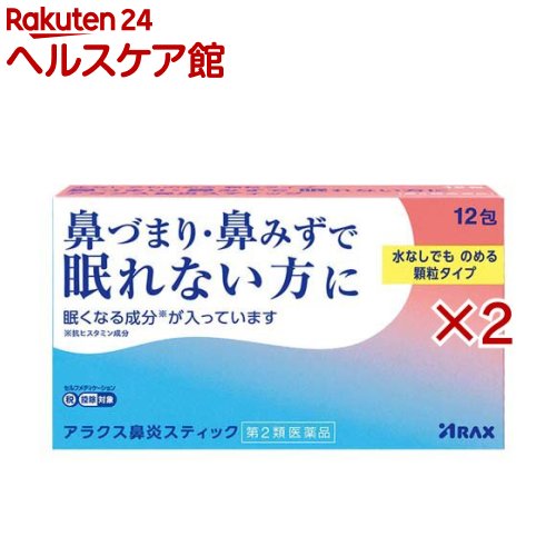 お店TOP>医薬品>鼻炎薬・耳の薬>鼻水・鼻づまり>鼻炎薬 水なしで飲めるタイプ>アラクス鼻炎スティック (12包×2セット(セルフメディケーション税制対象))お一人様1セットまで。医薬品に関する注意文言【医薬品の使用期限】使用期限120日以上の商品を販売しております商品区分:第二類医薬品【アラクス鼻炎スティックの商品詳細】●アラクス鼻炎スティックは4種の有効成分を配合し、眠りを妨げる鼻づまり・鼻みずによく効きます。●ノンカフェインで、就寝前にも服用しやすい、水なしでものめる顆粒タイプの鼻炎薬です。※眠くなる成分(抗ヒスタミン成分)が入っています。【販売名】アラクス鼻炎スティック【効能 効果】急性鼻炎、アレルギー性鼻炎又は副鼻腔炎による次の諸症状の緩和:くしゃみ、鼻みず(鼻汁過多)、鼻づまり、なみだ目、のどの痛み、頭重(頭が重い)【用法 用量】次の用量を服用してください。服用間隔は4時間以上おいてください。年齢:1回量:1日服用回数15歳以上:1包:3回11歳以上15歳未満:2/3包:3回7歳以上11歳未満:1/2包:3回7歳未満の小児:服用しないこと★用法・用量に関連する注意(1)定められた用法・用量を厳守してください。(2)小児に服用させる場合には、保護者の指導監督のもとに服用させてください。【成分】3包中(1包0.7g)d-クロルフェニラミンマレイン酸塩:6mgフェニレフリン塩酸塩:15mgベラドンナ総アルカロイド:0.4mgグリチルリチン酸二カリウム:30mg添加物としてキシリトール、トウモロコシデンプン、香料を含有する。【注意事項】★使用上の注意(守らないと現在の症状が悪化したり、副作用・事故が起こりやすくなります)・してはいけないこと1.本剤を服用している間は、次のいずれの医薬品も使用しないでください他の鼻炎用内服薬、抗ヒスタミン剤を含有する内服薬等(かぜ薬、鎮咳去痰薬、乗物酔い薬、アレルギー用薬等)、胃腸鎮痛痙薬2.服用後、乗物又は機械類の運転操作をしないでください(眠気や目のかすみ、異常なまぶしさ等の症状があらわれることがあります。)3.長期連用しないでください・相談すること1.次の人は服用前に医師、薬剤師又は登録販売者に相談してください(1)医師の治療を受けている人。(2)妊婦又は妊娠していると思われる人。(3)高齢者。(4)薬などによりアレルギー症状を起こしたことがある人。(5)次の症状のある人。高熱、排尿困難(6)次の診断を受けた人。緑内障、糖尿病、甲状腺機能障害、心臓病、高血圧2.服用後、次の症状があらわれた場合は副作用の可能性があるので、直ちに服用を中止し、説明文書を持って医師、薬剤師又は登録販売者に相談してください関係部位:症状皮膚:発疹・発赤、かゆみ消化器:吐き気・嘔吐、食欲不振精神神経系:頭痛泌尿器:排尿困難その他:顔のほてり、異常なまぶしさまれに下記の重篤な症状が起こることがあります。その場合は直ちに医師の診療を受けてください。症状の名称:症状再生不良性貧血:青あざ、鼻血、歯ぐきの出血、発熱、皮膚や粘膜が青白くみえる、疲労感、動悸、息切れ、気分が悪くなりくらっとする、血尿等があらわれる。無顆粒球症:突然の高熱、さむけ、のどの痛み等があらわれる。3.服用後、次の症状があらわれることがあるので、このような症状の持続又は増強が見られた場合には、服用を中止し、説明文書を持って医師、薬剤師又は登録販売者に相談してください口のかわき、眠気、便秘、目のかすみ4.5〜6回服用しても症状がよくならない場合は服用を中止し、説明文書を持って医師、薬剤師又は登録販売者に相談してください★保管及び取扱い上の注意(1)直射日光の当たらない湿気の少ない涼しい所に保管してください。(2)小児の手の届かない所に保管してください。(3)他の容器に入れ替えないでください(誤用の原因になったり品質が変わります。)。(4)1包を分割した残りを使用する場合には、袋の口を折り返して保管し、2日以内に使用してください。(5)使用期限をすぎた製品は服用しないでください。【医薬品販売について】1.医薬品については、ギフトのご注文はお受けできません。2.医薬品の同一商品のご注文は、数量制限をさせていただいております。ご注文いただいた数量が、当社規定の制限を越えた場合には、薬剤師、登録販売者からご使用状況確認の連絡をさせていただきます。予めご了承ください。3.効能・効果、成分内容等をご確認いただくようお願いします。4.ご使用にあたっては、用法・用量を必ず、ご確認ください。5.医薬品のご使用については、商品の箱に記載または箱の中に添付されている「使用上の注意」を必ずお読みください。6.アレルギー体質の方、妊娠中の方等は、かかりつけの医師にご相談の上、ご購入ください。7.医薬品の使用等に関するお問い合わせは、当社薬剤師がお受けいたします。TEL:050-5577-5042email:kenkocom_4@shop.rakuten.co.jp【原産国】日本【発売元、製造元、輸入元又は販売元】アラクス※説明文は単品の内容です。リニューアルに伴い、パッケージ・内容