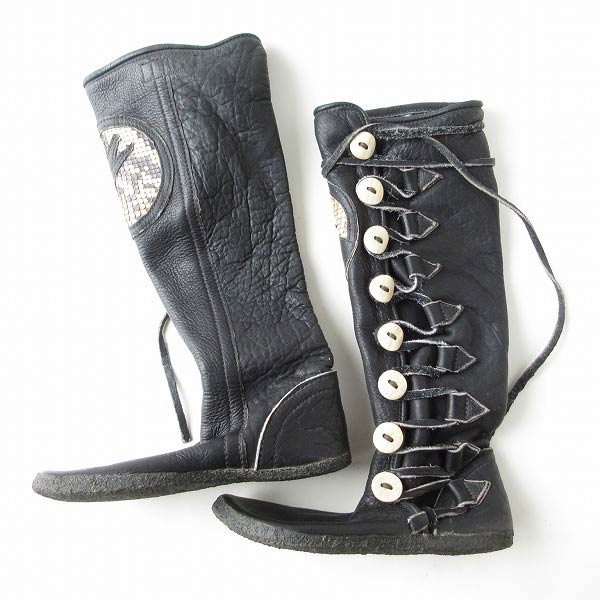 商品詳細 商品番号 D108-32-0237 商品名 一点物/美品/Richard Heinel/ハンドメイド/本革/モカシン/ブーツ/黒【23.5cm】インディアン/ヒッピーブーツ/D108 生産国 記載なし 素材 ・アッパー:本革 ・ソール:ラバー 商品説明 アメリカから買い付けたアイテムです。 Richard Heinelのハンドメイド モカシンブーツです。 スネ側にヘビ革が使用されオオカミのデザインが入った素敵なデザイン。 紐は左右で長さが異なっており、左足側が長く、右足側は短いです。 多少の使用感、レザー一部に血筋などはありますが、綺麗な美品ですので問題なくまだまだ履いていただけます。 箱・シューキーパーについて 箱はありません。また撮影時に使用しているシューキーパーは付属しません。 注意事項ご使用のパソコンのディスプレイにより表示される画像の色が 異なる場合がございます。 SIZE(サイズ) 表記サイズ 不明 アウトソール(つま先〜踵まで) 約25.0cm 横幅(アウトソール一番広い所) 約10.3cm 横幅(アウトソール一番広い所) 約42cm 参考サイズ 参考までにサイズですが、こちらはレディース23.5cm程度の普通幅の方が適応サイズです。 28,380円 税込 送料別 カードOK 古着屋 BRIDGE ![]() | ||