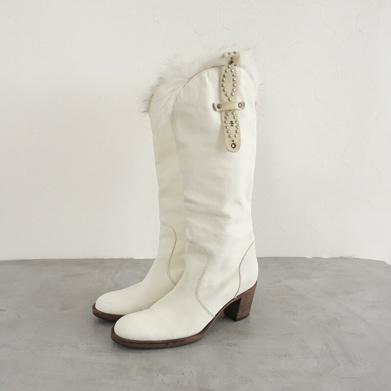表記サイズ:38.5 実寸サイズ:スタッフ試着によるサイズ23.5cm, ヒールの高さ6.7cm, 高さ(ヒール含む)約45.5cm, 筒周り(内側)33.5cm (多少の誤差はご了承ください) 素材: デザイン:HENRY BEGUELINのレザーロングブーツです。カラーはホワイトで、レザー素材です。履き口が半円状にカットされており、サイドにストラップがあしらわれております。内側はファー仕様で、ヒールは木目調です。 状態:ユーズドで、アッパーの所々に汚れ、スレ、ストラップ近くに緑青の跡、ヒール部に減りが見受けられますが、目立ったダメージはございません。ご理解頂ける方のご購入をお待ちしております。 NO.sha88-2402-21 16,747円 税込 送料別 カードOK ブランド古着買取drop ![]() | ||