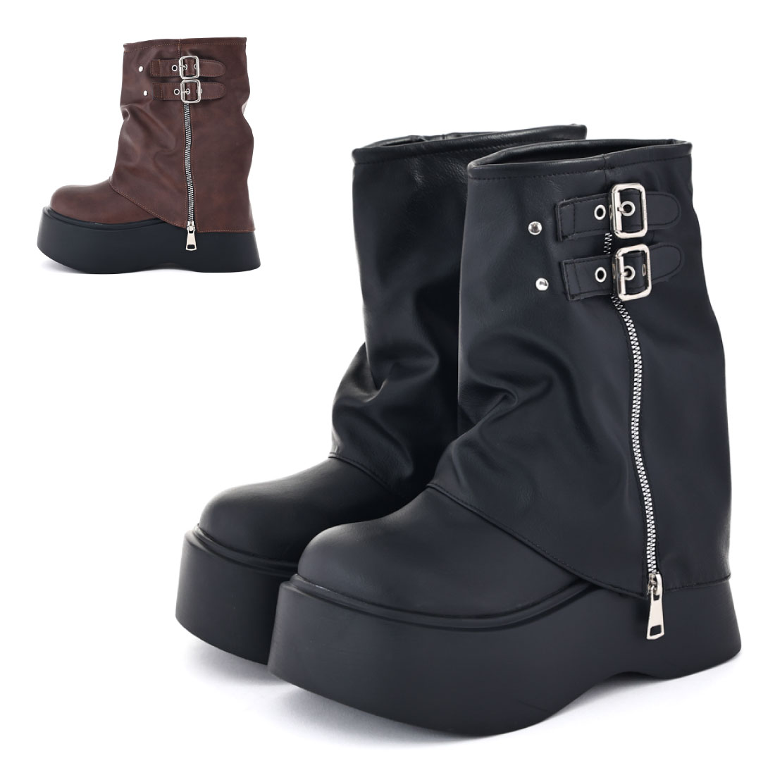 2タイプ丈が選べる!ルーズなシルエットが珍しく目を意くブーツ。サイドにはベルトとジップを施しちょっぴり辛口なムードに。約6cmの厚底ソールはプラットフォーム型で安定感のある履き心地。ナチュラルに足を長く魅せスタイルアップ効果も抜群◎艶を抑えたフェイクレザーはコーデに馴染みやすく大人っぽい仕上がりに。ミニスカートやショートパンツに合わせたY2Kなスタイリングが今っぽい。 サイズ 35(22.5cm) 36(23cm) 37(23.5cm) 38(24cm) 39(24.5cm) 4... 3,480円 税込 送料別 カードOK ツボラボ ![]() | ||