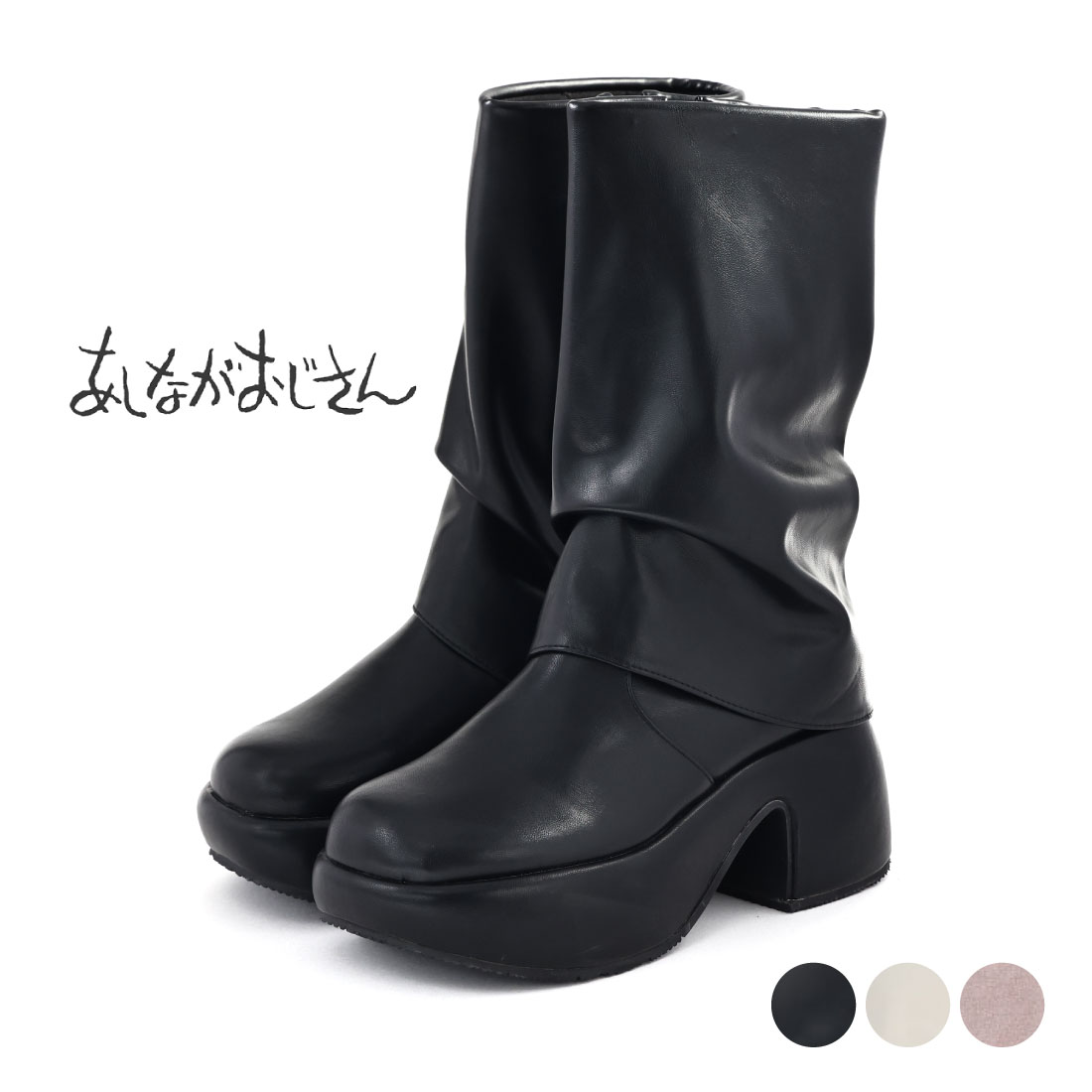 商品情報 素材 ブラック/アイボリー:合成皮革、ピンクベージュ:合成繊維 原産国 中国 ヒール高 約 8cm プラットフォーム高 約 4cm 筒丈 約 25cm カラー ブラック アイボリー ピンクベージュ 取り扱いサイズ 【S】22.5cm-23cm相当 【M】23cm-23.5cm相当 【L】23.5cm-24cm相当 【LL】24cm-24.5cm相当 特長 byあしながおじさんの人気アイテム、厚底おでこストラップパンプス と同じ底周りを使用した、ブランドらしさが詰まった厚底ブーツが誕生。つんと上向いた"おでこトゥ"のぽってりシルエットは唯一無二の存在感。トレンドライクなカバーデザインを重ねて、今の気分に合う一足に仕上げました。やや長めのミドル丈はショートパンツやミニスカートとも好相性。Y2Kテイストなスタイリングにもぴったり嵌ります。 履きやすさのポイント ・幅広トゥラインで指先ゆったり ・ソフト筒で足の動きを妨げない ・厚底ソールで斜が少なく歩きやすい 注意点:モニターの発色具合によって実際のものと色が異なる場合があります。また、商品によっては【靴箱の破損・色あせ】や【靴箱内の包装用紙破れ・用紙なし】【製造上のボンドの付着】が生じる場合がございます。仕様上問題ないと判断された商品を出荷をしておりますので安心してご使用ください。メーカー希望小売価格はメーカーサイトに基づいて掲載しています。 ※クリックするとメーカーWEBページ抜粋部分を表示します。 13,750円 税込 送料別 カードOK GALLERY ![]() | ||