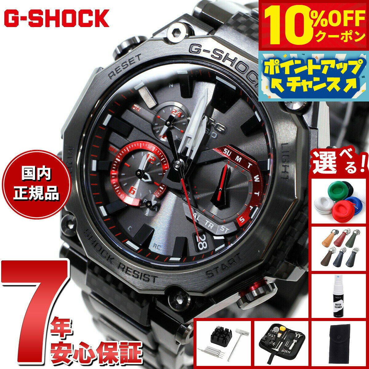 カーボン繊維強化樹脂によるモノコックケースとメタル素材を融合したMTG-B2000をベースに、ベゼルパーツにもカーボン素材を採用し軽量化を図ったモデルです。カーボン製ベゼルは、カーボンファイバーシートとグラスファイバーシートを積層し熱プレスでプレート状の母材を作り、そこから切削加工して成形します。MTG-B2000YBDは、時計側面のベゼルフレーム部をカーボン素材に変更。ステンレス製に比べ重量が大幅に減り、ベゼルフレームが約77%軽量化されました。ベゼルフレームの最上層のカーボンシートは、3時、6時、9時、12時位置で側面に回り込むように重ね強化し、ラグ部分は筒状にカーボンシートを巻き付けることにより耐久性を強化しています。グラスファイバー層にはG-SHOCKのブランドカラーであるレッドを採用しアクセントにしています。MTG-B2000XDは、トップベゼルをカーボン化し、積層したグラスファイバー層に初採用のグリーンカラーを用い新鮮なデザインに仕上げました。また、透明度の高いサファイアガラスの採用と、カシオ山形工場の微細加工技術による繊細な彫刻を施したダイアルなど商品全体の質感も高くなっています。加えてバンド交換も可能な「レイヤーコンポジットバンド」を採用し、メタルの質感を向上しつつ軽量化に成功しました。機能面ではBluetooth(R)通信機能により専用アプリ「G-SHOCK Connected」と接続し時刻情報を取得。マルチバンド6とタフソーラー、高輝度なLEDライトも搭載し、実用的な機能を備えます。商品名MT-G G-SHOCK 電波 ソーラー 電波時計 カシオ Gショック CASIO 腕時計 メンズ スマートフォンリンク タフソーラー MTG-B2000YBD-1AJF商品番号MTG-B2000YBD-1AJFブランドカシオ Gショック CASIO G-SHOCKムーブメントアナログ ソーラー電波時計 モジュールNo:5636■トリプルGレジスト(耐衝撃構造・耐遠心重力性能・耐振動構造)■タフソーラー(ソーラー充電システム)■20気圧防水機能■電波受信機能:自動受信(最大6回/日)(中国電波は最大5回/日)/手動受信、<日本>受信電波:JJY、周波数:40kHz/60kHz(福島/九州両局対応モデル)<北米地域>受信電波:WWVB、周波数:60kHz<ヨーロッパ地域>受信電波:MSF/DCF77、周波数:60kHz/77.5kHz<中国>受信電波:BPC、周波数:68.5kHz*ホームタイム設定を受信可能な時差に設定すると、時差に合わせた局を受信します。■モバイルリンク機能(AutomaticConnection、対応携帯電話とのBluetooth®通信による機能連動)■針位置自動補正機能■針退避機能(時針と分針がインダイアルと重なって見づらい時は、時針と分針をインダイアルの上から一時的に退避させることができます)■デュアルタイム(27タイムゾーン、サマータイム自動設定機能付き、ホームタイムの時刻入替機能付き)■ストップウオッチ(1秒、24時間計)■タイマー(セット単位:1分、最大セット:24時間、1秒単位で計測)■時刻アラーム■パワーセービング機能(暗所では一定時間が経過すると運針を停止して節電します)■日付・曜日表示■フルオートカレンダー■LEDライト(スーパーイルミネーター、残照機能付き)■フル充電時からソーラー発電無しの状態での駆動時間機能使用の場合:約5ヵ月パワーセービング状態の場合:約29ヵ月※電波受信が行われない場合や、スマートフォンと連携しない場合は、通常のクオーツ精度(平均月差±15秒)で動作します。G-SHOCK Connected(無料):■セルフチェック■時計ステータス表示■ワールドタイム■ホームタイムとワールドタイムの時刻入替■時刻アラーム設定■携帯電話探索※スマートフォンと通信接続を行うには、専用アプリ「G-SHOCK Connected」のインストールが必要です。メーカー指定のiPhone、Androidスマートフォンに対応しています。動作確認済み端末やOS対応状況など、詳しくはWEBにてご確認ください。※Bluetoothが搭載されている端末に限ります。ネオブライト球面・曲面ガラスねじロック式りゅうずLED:ホワイトケース:IP処理(SS部)バンド:IP処理(SS部)バンド装着可能サイズ:150〜205mmバンドアジャスト:Cリングタイプ風防素材サファイアガラス(内面反射防止コーティング)ケース素材樹脂/ステンレススチールケースサイズ55.1×49.8mmケース厚15.9mmバンド素材ステンレスムク/樹脂バンドバンド留金タイプワンプッシュ三つ折れ式中留腕周り(最大)20.5cm文字盤カラーブラック本体重量131g保証期間メーカー正規保証1年間付属取扱説明書 / 保証書 / 専用BOXその他のサービスメーカー希望小売価格はメーカーサイトに基づいて掲載していますMT-G G-SHOCK 電波 ソーラー 電波時計 カシオ Gショック CASIO 腕時計 メンズ スマートフォンリンク タフソーラー MTG-B2000YBD-1AJF カーボン繊維強化樹脂によるモノコックケースとメタル素材を融合したMTG-B2000をベースに、ベゼルパーツにもカーボン素材を採用し軽量化を図ったモデルです。カーボン製ベゼルは、カーボンファイバーシートとグラスファイバーシートを積層し熱プレスでプレート状の母材を作り、そこから切削加工して成形します。MTG-B2000YBDは、時計側面のベゼルフレーム部をカーボン