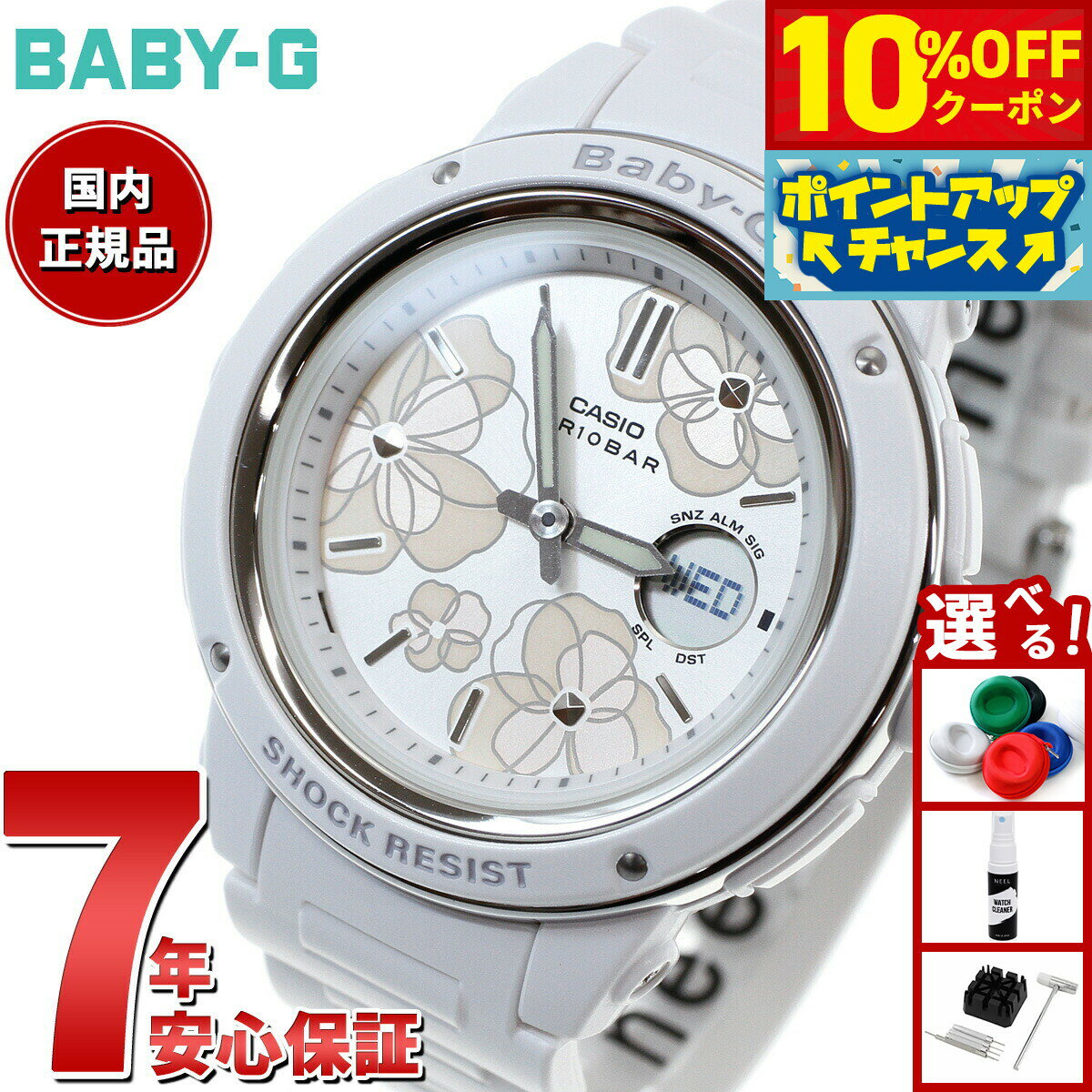 アクティブな女性のためのカジュアルウオッチBABY-Gから、フェイスに花柄をあしらった「フローラル・ダイアル・シリーズ」の登場です。ベースモデルは、ワイドフェイスでシンプルなデザインが人気のBGA-150。文字板に上品に仕上げた花柄をデザインし、手元に華やかな色合いを添えます。また、1時・5時・9時位置のインデックスを兼ねている花の中心部には、メタリックなスタッズデザインを採用し、質感を上げています。時刻を確認するのが楽しくなるような、ワンポイントを追加。エレガントなフラワーパターン×クールなスタッズが女性心をくすぐる、Newモデルの登場です。商品名BABY-G カシオ ベビーG レディース 腕時計 フローラル ダイアル 花柄 BGA-150FL-7AJF商品番号BGA-150FL-7AJFブランドカシオ ベビーG CASIO BABY-Gムーブメントアナデジ クォーツ モジュールNo:5595■耐衝撃構造■10気圧防水機能■ワールドタイム:世界27都市(29タイムゾーン、サマータイム設定機能付き)+GMT(グリニッジ標準時)の時刻表示■ストップウオッチ(1秒、60分計、スプリット付き)■タイマー(セット単位:1分、最大セット:60分、1秒単位で計測、オートリピート、タイムアップ予告機能付き)■時刻アラーム5本(1本のみスヌーズ機能付き)・時報■電池寿命約3年■フルオートカレンダー■12/24時間制表示切替■LEDライト(残照機能、残照時間切替(1.5秒/3秒)付き)精度:±30秒ショックレジストLED:アンバーバンド装着可能サイズ:125〜180mm風防素材無機ガラスケース素材樹脂/ステンレススティールケースサイズ47.5×42.8mmケース厚12.8mmバンド素材樹脂バンドバンド留金タイプ美錠腕周り(最大)18cm本体重量43g保証期間メーカー正規保証1年間付属取扱説明書 / 保証書 / 専用BOXその他のサービスメーカー希望小売価格はメーカーサイトに基づいて掲載していますBABY-G カシオ ベビーG レディース 腕時計 フローラル ダイアル 花柄 BGA-150FL-7AJF アクティブな女性のためのカジュアルウオッチBABY-Gから、フェイスに花柄をあしらった「フローラル・ダイアル・シリーズ」の登場です。ベースモデルは、ワイドフェイスでシンプルなデザインが人気のBGA-150。文字板に上品に仕上げた花柄をデザインし、手元に華やかな色合いを添えます。また、1時・5時・9時位置のインデックスを兼ねている花の中心部には、メタリックなスタッズデザインを採用し、質感を上げています。時刻を確認するのが楽しくなるような、ワンポイントを追加。エレガントなフラワーパターン×クールなスタッズが女性心をくすぐる、Newモデルの登場です。 11,880円 税込 送料込 カードOK レビュー55件 neelセレクトショップ ![]() | ||