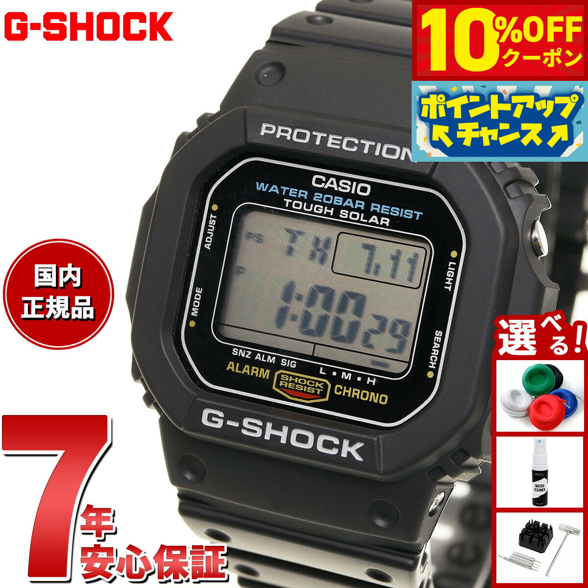 初代G-SHOCKのデザインを受け継いだ5600のタフソーラーモデル。赤いラインが特徴的な、従来のタフソーラーモデルG-5600に対し、スクエアデザインの中でもシンプルな配色のDW-5600C(1987年発売)のカラーリングを採用しました。G-SHOCKを代表するクラシックデザインモデルです。商品名G-SHOCK Gショック G-5600UE-1JF ソーラー 5600 ブラック デジタル メンズ 腕時計 カシオ CASIO タフソーラー商品番号G-5600UE-1JFブランドカシオ Gショック CASIO G-SHOCKムーブメントデジタル ソーラー モジュールNo:3496■耐衝撃構造■タフソーラー(ソーラー充電システム)■20気圧防水機能■ワールドタイム5本:世界48都市(31タイムゾーン)+UTC(協定世界時)の時刻表示、ホームタイムの都市入替機能付き■ストップウオッチ(1/100秒(1時間未満)/1秒(1時間以上)、24時間計、スプリット付き)■タイマー(セット単位:1秒、最大セット:24時間、1秒単位で計測)■時刻アラーム5本(1本のみスヌーズ機能付き)・時報■バッテリーインジケーター表示■パワーセービング機能(暗所では一定時間が経過すると表示を消して節電します)■フルオートカレンダー■12/24時間制表示切替■操作音ON/OFF切替機能■日付表示(月/日表示入替)■曜日表示(英・西・仏・独・伊・露の6ヵ国語切替)■LEDバックライト(フルオートライト、スーパーイルミネーター、残照機能、残照時間切替(1.5秒/3秒)付き)■フル充電時からソーラー発電無しの状態での駆動時間機能使用の場合:約12ヵ月パワーセービング状態の場合:約22ヵ月ショックレジストLED:ホワイトバンド装着可能サイズ:145〜205mm風防素材無機ガラスケース素材樹脂ケースサイズ46.7×43.2mmケース厚12.7mmバンド素材樹脂バンドバンド留金タイプ美錠腕周り(最大)20.5cm本体重量51g保証期間メーカー正規保証1年間付属取扱説明書 / 保証書 / 専用BOXその他のサービスメーカー希望小売価格はメーカーサイトに基づいて掲載していますG-SHOCK Gショック G-5600UE-1JF ソーラー 5600 ブラック デジタル メンズ 腕時計 カシオ CASIO タフソーラー 初代G-SHOCKのデザインを受け継いだ5600のタフソーラーモデル。赤いラインが特徴的な、従来のタフソーラーモデルG-5600に対し、スクエアデザインの中でもシンプルな配色のDW-5600C(1987年発売)のカラーリングを採用しました。G-SHOCKを代表するクラシックデザインモデルです。 14,960円 税込 送料込 カードOK レビュー48件 neelセレクトショップ ![]() | ||