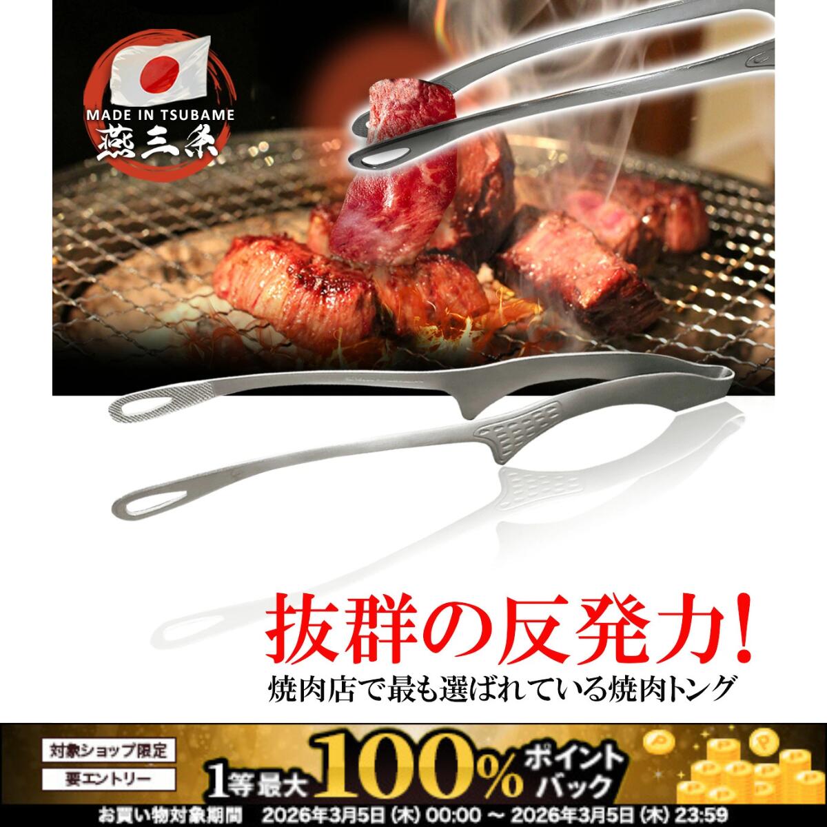 \テーブルが引き締まる/黒のトングはこちらをクリック◆! 【日本製】燕三条 焼肉トング トング 食洗器対応 焼き肉 揚げ物 仙武堂 MMmall 現在焼肉店で一番愛用されてる焼肉トングです。様々な焼肉用のトングが販売される中、高い指示を受ける形状です。抜群の反発力と適度な硬さを再現できるのは日本製ならではの特徴です。 【日本製】現在焼肉店で一番愛用されてる焼肉トングです。様々な焼肉用のトングが販売される中、高い指示を受ける形状です。抜群の反発力と適度な硬さを再現できるのは日本製ならではの特徴です。【あなたの選ぶ製品は?日本製or海外製?】確かに最近の海外製はレベルも上がり良い商品もたくさん存在します。ですが日本の職人による精密に計算された商品は今もなお世界の認める部分になります。その日本の中でも世界的に有名な鍛冶の町、新潟県燕三条の金物製品は日本全国のありとあらゆるステンレス商品を作り続けています。【トングの命!】それは先端部の組み合わせ。寸分の狂いもない精密性。食材をつかむ先端部は嚙み合わせが寸分の狂いもなくピッタリとフィット!これこそが一流職人のなせる技!どんな食材もしっかりとつかみます。薄切り肉や揚げ物などのお料理にマルチに大活躍間違いなしです。 5 テーブルが引き締まる!漆黒のトング。 生肉専用、焼けた肉専用。使い分けのための2本セット シリーズ販売累計10000本突破!焼肉、揚げ物、とりわけに。 880円 税込 送料込 カードOK レビュー88件 MMMoru ![]() | ||