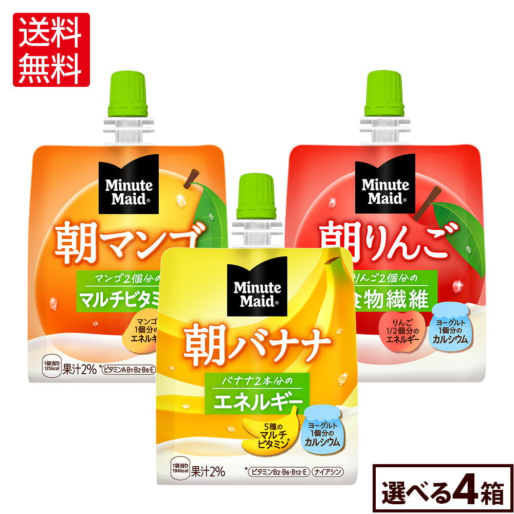 『ミニッツ メイド 朝バナナ』は、管理栄養士推奨の果物由来の栄養素と果汁感が特長のゼリー飲料です。バナナ2本分のエネルギー*、マルチビタミン、ヨーグルト1個分のカルシウム**を、バナナとヨーグルトの風味で、手軽に摂ることができます。*バナナ1本分を可食部分105gとしています**ヨーグルト1個を100gとしています『ミニッツ メイド 朝りんご』は、管理栄養士推奨の果物由来の栄養素と果汁感が特長のゼリー飲料です。リンゴ2個分の食物繊維*、リンゴ1/2個のエネルギー、ヨーグルト1個分**のカルシウムを、リンゴとヨーグルトの風味で、手軽に摂ることができます。*リンゴ1個分を可食部分255gとしています**ヨーグルト1個を100gとしています『ミニッツ メイド 朝マンゴ』は、管理栄養士推奨の果物由来の栄養素と果汁感が特長のゼリー飲料です。マンゴ2個分のマルチビタミン*、マンゴ1個分のエネルギー、ヨーグルト1個分**のカルシウムを、マンゴとヨーグルトの風味で、手軽に摂ることができます。*マンゴ1個分を可食部分195gとしています**ヨーグルト1個を100gとしていますおやつや小腹満たしはもちろんのこと、慌ただしく、生活リズムや食生活が乱れがちな朝にぴったり。お好きな種類を4種類選ぶと全国送料無料になるお得なよりどりセットですので、ぜひお試しください。製品仕様商品名ミニッツメイド朝バナナ 180g×6個ミニッツメイド朝マンゴ 180g×6個ミニッツメイド朝りんご 180g×6個商品情報詳細は商品画像よりご確認ください。入数6個×4箱/合計24個保存方法高温・直射日光をさけてください販売者コカ・コーラ カスタマーマーケティング(株)東京都港区六本木6-2-31 【ご確認ください】 ●当店は、メーカー直送となっており、コカ・コーラ社の倉庫にあります検品済の最新の商品をメーカーの出荷基準に基づき出荷しております。 ●賞味期限については、メーカーの出荷基準である「賞味期限まで2カ月以上ある商品」を出荷致します。賞味期限は商品によって異なりますので、賞味期限についてご不明な点がございましたら、ご注文前に当店までお問合せください。 ●賞味期限のご指定、ご注文後の商品変更・キャンセルなどのご要望にお応えできない場合がございますので、予めご了承ください。 4,720円 税込 送料込 カードOK レビュー4件 格安飲料専門店ドリンクパートナー ![]() | ||