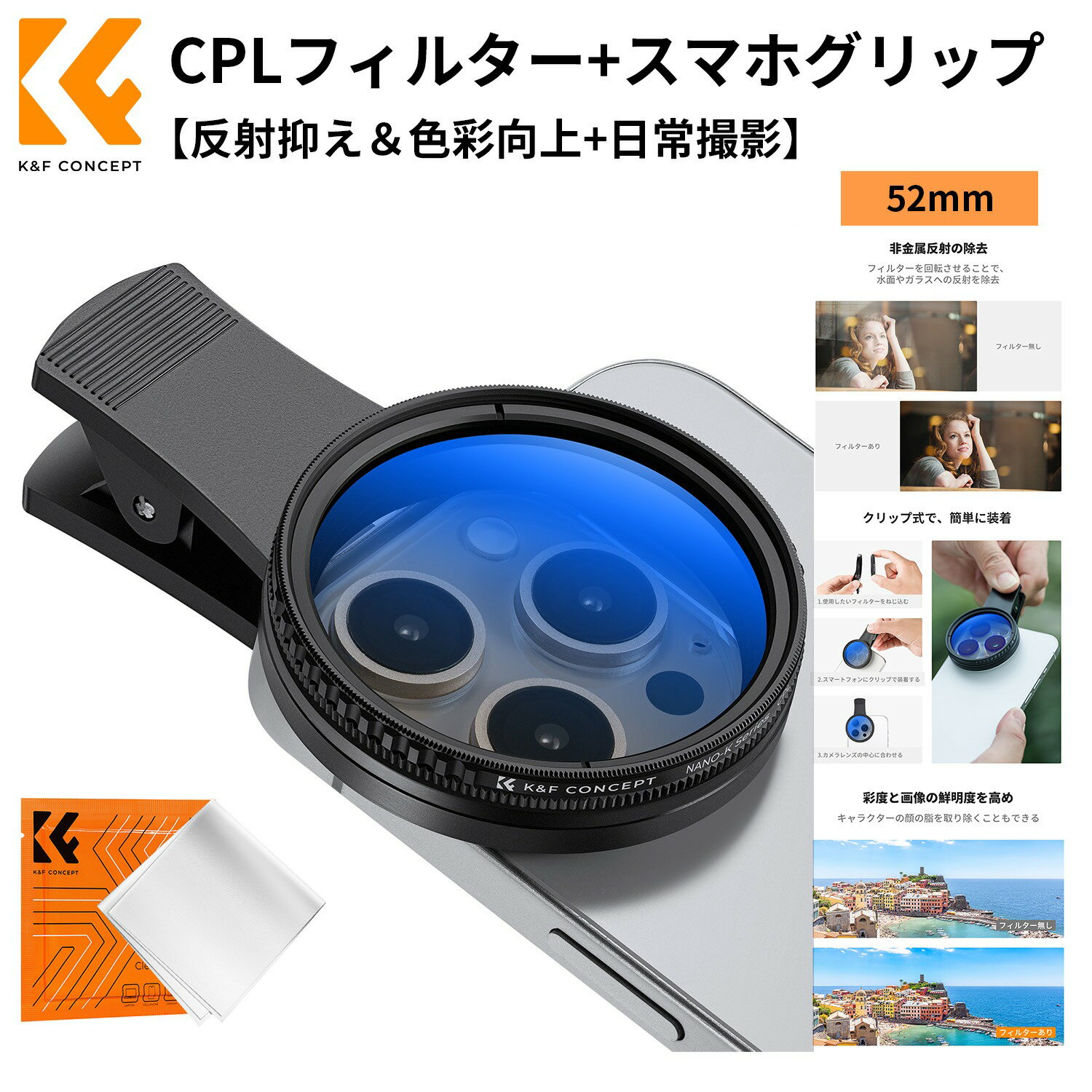 商品詳細 おすすめポイント 【 フィルター グリップ+CPLフィルターセット】52mm CPL(偏光)フィルターとクリップ式フィルターマウントがセットになるため、コンパクトで便利ながら、初心者でも簡単に使用できる。<使用上のご注意> ・本製品のクリップは、厚さ30mm以下、機器の端からカメラレンズの中心まで25mm以下のデバイスに対応します。この寸法を上回るデバイスには正しく取り付けることができませんのでご注意ください。 【プロフェッショナル携帯電話カメラクリップ&手軽に手持... 2,880円 税込 送料別 カードOK K&F CONCEPT 2号店 ![]() | ||