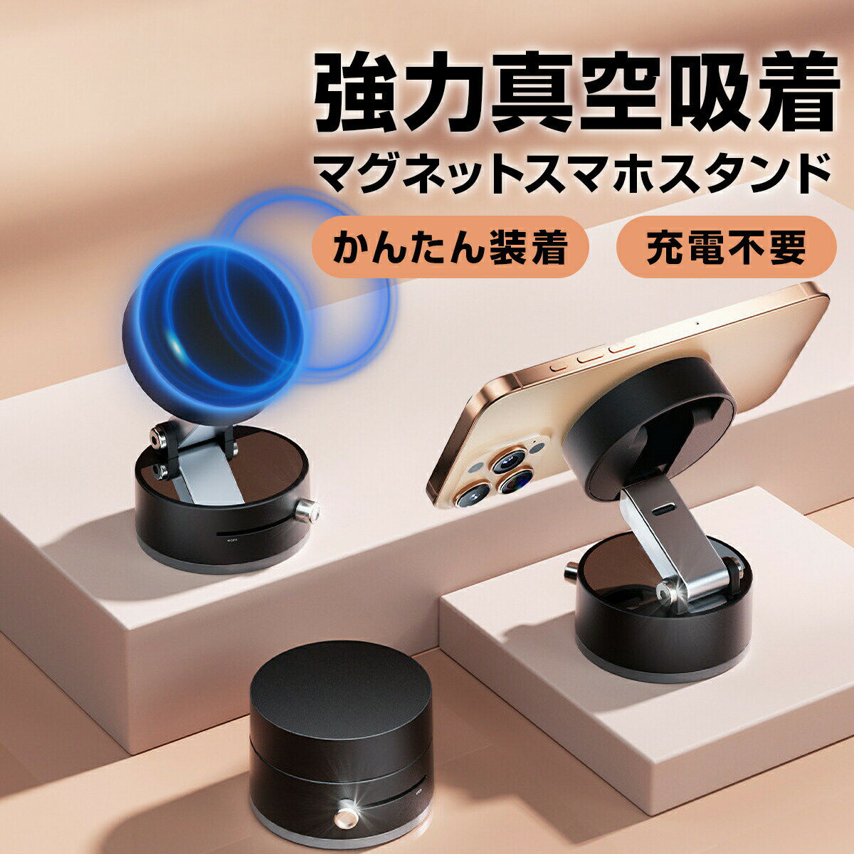 メーカー希望小売価格はメーカーカタログに基づいて掲載しています商品名称MagSafe対応 真空吸引式 スマホスタンド適応機種スマートフォンカラー01.ブラック02.ホワイト03.ピンク商品説明SNSで話題の"アレ"どこでも"秒"でピタッ!真空x磁力スタンド1.強力な真空吸着力と安定感2.磁石の力でガッチリ固定3.充電不要でいつでも使える4.家でも外でも大活躍5.購入前のよくある質問■強力な真空吸着力と安定感設置したい所でレバーをONにするだけで内部の空気が抜けて真空状態になり吸着・接着面は少し硬いシリコンのようなプルプル素材、押し込んで使用すると吸着力がさらに上がります。■磁石の力でガッチリ固定ネオジム系磁石でスマホを置くだけで、かんたんに、スマホを強力ホールドします。・MagSafe非対応機種、ケースでも使えるメタルプレート2枚付属■充電不要でいつでも使える固定は真空、スタンドは磁石なので充電やケーブルなどの電力を必要としません。・磁石面:135度、支柱部180度 無段階で調整できます。■家でも外でも大活躍・デスクビデオ通話、画面の常時確認マグネット固定できる小物収納・キッチンまわりレシピを見ながらの料理、煮込み料理の待ち時間など・新幹線&飛行機移動中では角度無段階調整が動画の視聴に大活躍します。・自動車音楽や地図アプリの確認など手で持たずにスマホを見れます。※運転中の"ながらスマホ"は道路交通法違反になりますので停車時のみご利用ください。■購入前のよくある質問Q. どんな箇所に取り付けできますか?A. ガラスや鏡などツルツルした平らな面が最適です。車のダッシュボードや布、凹凸のある面では付属のゲルマットを先に貼り付けてからご利用いただければ取り付けいだだけます。Q. スマホケースをつけたままでも使えますか?A. MagSafe対応ケースをお使いの場合はお使いいただけます。非対応ケースの場合は付属品のメタルプレートを貼り付けてお使いいただけます。Q. 付属品はどんなものがありますか?・アルコールシート ゲルマット貼り付け前に脱脂を行うもの・メタルプレート MagSafe非対応のスマホケースに使用・六角レンチ 無段階調節がゆるくなった際に締め込む・ゲルマット 凹凸のある所での吸盤補助に使用Q. 接着面(吸盤部分)は汚れたら洗えますか?A. はい、接着面(吸盤部分)は水洗いすることができます。汚れてきたら吸着が弱くなるのでホコリなどを除去してお使いください。●使い方のかんたん3ステップ●1.軽く押し付ける本体を装着したい部分に軽く押し付けながら置いてください。接着面はホコリや異物が無いように軽く払っておいてください。2.ONへレバーを動かす押さえつけたままレバーをONの方向へ動かしてください。少し抵抗を感じるくらいがちょうどよい吸着になります。3.スタンド部分を起こす本体上部を引き上げるようにしてスタンド部分を起こしてスマホを固定してお使いください。商品到着後に使い方、取り付け方法がわからない場合はこちらをご覧になってお使いください。商品名称MagSafe対応 真空吸引式 スマホスタンド適応機種スマートフォンカラー01.ブラック02.ホワイト03.ピンク商品説明SNSで話題の"アレ"どこでも"秒"でピタッ!真空x磁力スタンド1.強力な真空吸着力と安定感2.磁石の力でガッチリ固定3.充電不要でいつでも使える4.家でも外でも大活躍5.購入前のよくある質問■強力な真空吸着力と安定感設置したい所でレバーをONにするだけで内部の空気が抜けて真空状態になり吸着・接着面は少し硬いシリコンのようなプルプル素材、押し込んで使用すると吸着力がさらに上がります。■磁石の力でガッチリ固定ネオジム系磁石でスマホを置くだけで、かんたんに、スマホを強力ホールドします。・MagSafe非対応機種、ケースでも使えるメタルプレート2枚付属■充電不要でいつでも使える固定は真空、スタンドは磁石なので充電やケーブルなどの電力を必要としません。・磁石面:135度、支柱部180度 無段階で調整できます。■家でも外でも大活躍・デスクビデオ通話、画面の常時確認マグネット固定できる小物収納・キッチンまわりレシピを見ながらの料理、煮込み料理の待ち時間など・新幹線&飛行機移動中では角度無段階調整が動画の視聴に大活躍します。・自動車音楽や地図アプリの確認など手で持たずにスマホを見れます。※運転中の"ながらスマホ"は道路交通法違反になりますので停車時のみご利用ください。■購入前のよくある質問Q. どんな箇所に取り付けできますか?A. ガラスや鏡などツルツルした平らな面が最適です。車のダッシュボードや布、凹凸のある面では付属のゲルマットを先に貼り付けてからご利用いただければ取り付けいだだけます。Q. スマホケースをつけたままでも使えますか?A. MagSafe対応ケースをお使いの場合はお使いいただけます。非対応ケースの場合は付属品のメタルプレートを貼り付けてお使いいただけます。Q. 付属品はどんなものがありますか?・アルコールシート ゲルマット貼り付
