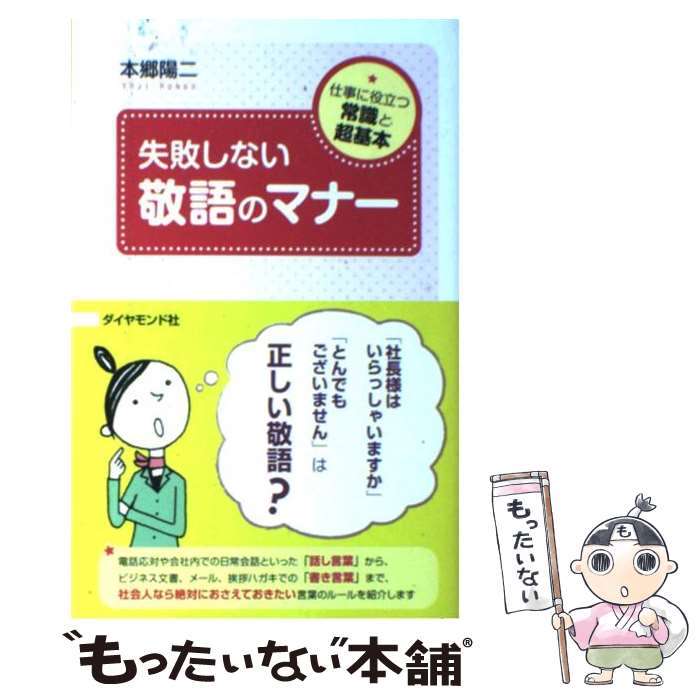 110. 【メール便送料無料、通常24時間以内出荷】 【中古】 失敗しない敬語のマナー 仕事に役立つ常識と超基本 / 本郷 陽二 / ダイヤモンド社 [単行本]【メール便送料無料】【最短翌日配達対応】 著者:本郷 陽二出版社:ダイヤモンド社サイズ:単行本ISBN-10:447800823XISBN-13:9784478008232■通常24時間以内に出荷可能です。※繁忙期やセール等、ご注文数が多い日につきましては 発送まで48時間かかる場合があります。あらかじめご了承ください。 ■メール便は、1冊から送料無料です。※宅配便の場合、2,500円以上送料無料です。※最短翌日配達ご希望の方は、宅配便をご選択下さい。※「代引き」ご希望の方は宅配便をご選択下さい。※配送番号付きのゆうパケットをご希望の場合は、追跡可能メール便(送料210円)をご選択ください。■ただいま、オリジナルカレンダーをプレゼントしております。■お急ぎの方は「もったいない本舗 お急ぎ便店」をご利用ください。最短翌日配送、手数料298円から■まとめ買いの方は「もったいない本舗 おまとめ店」がお買い得です。■中古品ではございますが、良好なコンディションです。決済は、クレジットカード、代引き等、各種決済方法がご利用可能です。■万が一品質に不備が有った場合は、返金対応。■クリーニング済み。■商品画像に「帯」が付いているものがありますが、中古品のため、実際の商品には付いていない場合がございます。■商品状態の表記につきまして・非常に良い: 使用されてはいますが、 非常にきれいな状態です。 書き込みや線引きはありません。・良い: 比較的綺麗な状態の商品です。 ページやカバーに欠品はありません。 文章を読むのに支障はありません。・可: 文章が問題なく読める状態の商品です。 マーカーやペンで書込があることがあります。 商品の痛みがある場合があります。● リピーター様、ぜひ応援下さい(ショップ・オブ・ザ・イヤー) 541円 税込 送料別 カードOK レビュー1件 もったいない本舗 楽天市場店 ![]() | ||