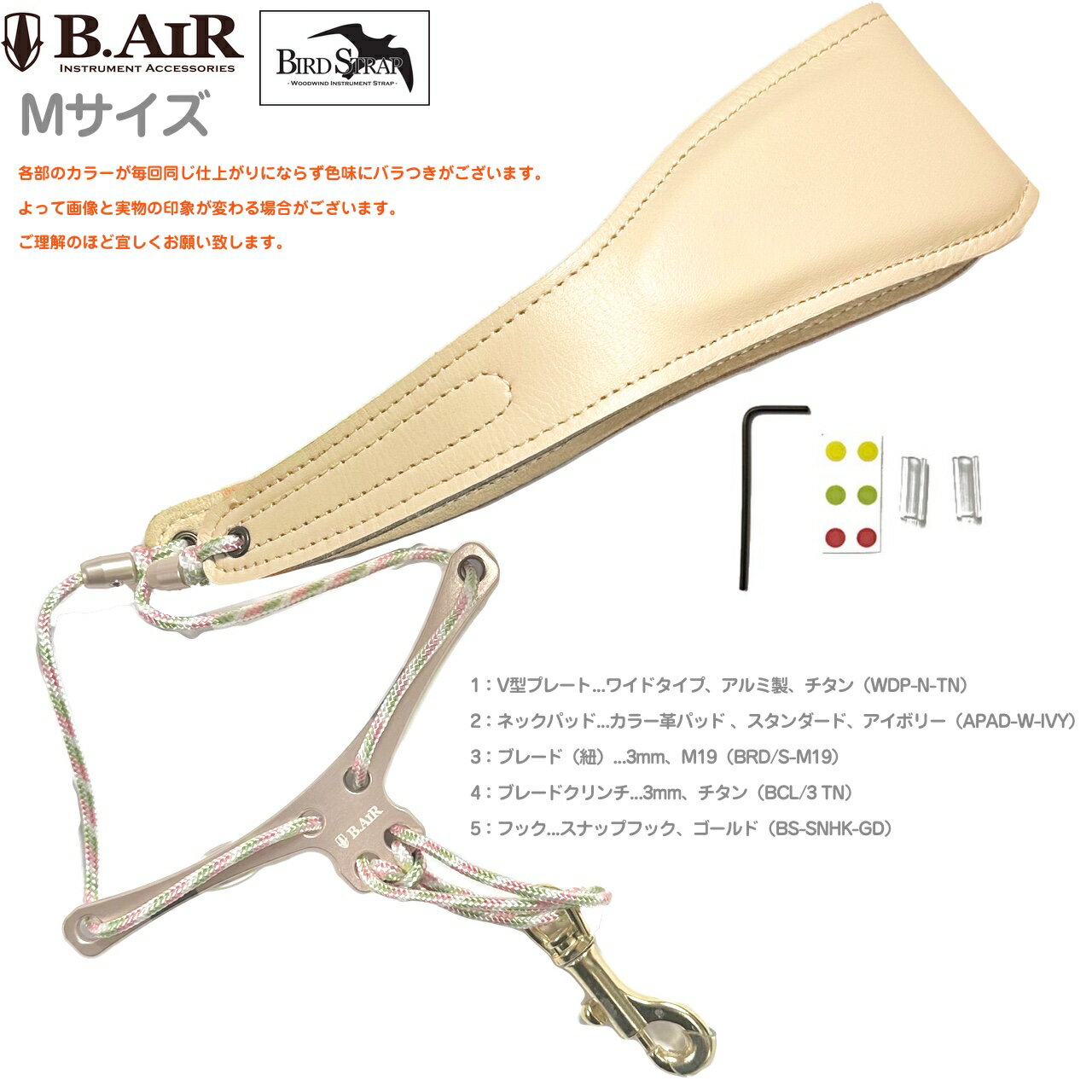 正規品 類似品ご注意下さい。各部のカラーが毎回同じ仕上がりにならず色味にバラつきがございます。よって画像と実物の印象が変わる場合がございます。ご理解のほど宜しくお願い致します。 カラーパッド、アイボリーを使用したオリジナルの組み合わせストラップ ▼BIRD STRAPについて バードストラップは、プロにも愛用者が多い日本製のストラップ。特徴は真ん中のV型のプレート。これによって首元も圧迫を防ぎます。 ネックストラップとしては高いですがしっかりとした品質で、各パーツを自由にカスタマイズできる仕組みになっており、古くなったパーツの交換など、ご自身でのメンテナンスも可能なので末永くご愛用いただけます。 また、カラーバリエーションが豊富なカスタムパーツや、パッドの両面、ステッチの色を自由に選べるカラーオーダーでは、自分好みのカラフルなストラップを作ることができます。 ▼カラーも豊富!カスタマイズできる5つのパーツ 1:V型プレート...見た目にも高級感のある削り出しアルミ製と、リーズブルなプラスチック製のものをラインナップ。 2:ネックパッド...厳選した国産の素材を使用。首への負担を少なくする形状と、フィット感を追求できます。 3:ブレード(紐)...十分に強度のあるナイロン芯入りの素材を使用。 4:ブレードクリンチ...留めネジでブレード(紐)をがっちりと固定。付属の専用レンチ1本で分解と組み立てが簡単にできるオリジナル紐留め金具。 5:フック...スナップフックにはフックリングの摩耗対策にビニール製のチューブを標準装備。ロック機能のないS字フック(別売)もラインナップ。※こちらの該当商品以外のパーツはすべて別売りです。サイズの調整や分解、組み立ての際はお客様の自己責任のもと慎重に作業を行っていただきますようお願い致します。 ▼各パーツの特徴●V型プレート オリジナルV型プレートは首元も圧迫を防ぎます。従来のストラップでは首元が締め付けられがちで負担がかかりやすいです。バードストラップでは首元を圧迫しない構造なので負担が軽減され息をよりスムーズに楽器に吹き込むことができます。 ・スタンダード...ストラップによる首元の圧迫を防ぐように幅をもたせた標準プレート。アルミ製 ・ワイド...スタンダードより幅を広くして機能性をアップさせたタイプ。アルミ製 ・プラスチック...ワイドの素材をプラスチックにした廉価版タイプ。カラーはブラックのみ。*アルミ製のものはカラー10色、メッキ仕上げのものが3色あります。詳細はパーツのページをご確認ください。 ●ネックパッド ・スタンダード...左右に分かれた厚めのスポンジクッションが、首や肩への負担を分散される標準タイプ。合皮、革製があります。 ・スリム...スタンダードより一回り小さく、首全体にフィットするように薄めのスポンジクッションを採用したタイプ。合皮、革製があります。 ・ライト...スポンジクッションのないシンプルな構造の廉価版タイプ。カラーはブラック、革製のみ。 ・ウォッシャブルタイプスタンダード...上記スタンダードの手洗いで繰り返し洗って使用することができるタイプです。 ・ウォッシャブルタイプスリム...上記スリムの手洗いで繰り返し洗って使用することができるタイプです。*カラーラインナップはパッドのタイプや素材によって異なり、最大で14色、また、特注カラーオーダーが可能なパーツはパッド裏、ステッチのカラーを選べるカスタマイズもあります。詳細はパーツのページをご確認ください。 ●ブレード(紐) 太さによって音や吹奏感に影響を与えます。 ・太さ2mm...音が飛びやすい ・太さ3mm...音がコントロールしやすい、近鳴りする感じがするよう*カラーラインナップは単色のものに加え、2色以上が入ったカラーのものがあります。2mmと3mmでカラーラインナップが若干異なります。詳細はパーツのページをご確認ください。 ●ブレードクリンチ 2mmもしくは3mmのどちらかブレード(紐)の太さにあったものを選びます。ブレード(紐)を固定する紐留め金具。付属の専用レンチで分解と組み立てします。組み立て方等詳しくはグレードクリンチ等商品説明ページ、または取扱説明書をご確認ください。*V型プレートと同じカラーラインナップです。詳細はパーツのページをご確認ください。 ●フック ・スナップフック...ロック機能によってストラップが楽器から外れにくい。ニッケル、ゴールドがあり。 ・S字フック...かぎ形フックタイプ。ロック機能がないので簡単に楽器を取り外しできます。ブラックのみ ▼サイズについて ストラップは楽器と奏者のセッティング(好み)によって長さを選ぶもので、ある程度の長さ調節ができるものです。 また、よくあるネックストラップでは難しいですが、バードストラップでは、ブレード(紐)を切ってサイズの変更が可能ですので、サイズにご不安がある方はワンサイズ上のサイズを選んでいただき、サイズ調整を行っていただくのも一つの手です。 ス
