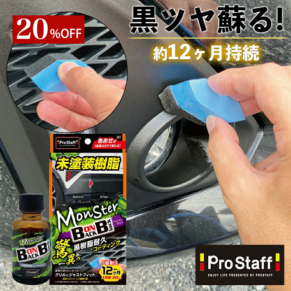 【以下のような箇所にご利用いただけます】 未塗装樹脂パーツ、ワイパー付近、グリル、フロントバンパー、サイドパーツ、リアバンパー 【下記と合わせてお使いいただけます】 ケミカ、ケミカル・清掃用品、車内アクセサリー、車種別専用品、芳香・消臭・イオン発生器、バッテリー、メンテナンス・添加剤、車内インテリアトラック用品 、バイク用ケミカル、バイクアクセサリー 、カー用品 【当店、プロスタッフ楽天市場店について】 新着商品、新商品、ランキング上位商品、人気商品、割引き、値引きセール商品、お得用商品、TVや雑誌などメディアに取り上げられた商品はお問い合わせが多く、数に限りがありますので、お早目にお買い求めください。 [関連ワード]車 未塗装樹脂 保護 マツダ マツダ3 mazda3 mini ヤリスクロス rav4 ラングラー レクサス nx ジムニー デイトナ バイク 未塗装樹脂 復活 コーティング プロスタッフ cx30 cx5 cx60 cx-5 cx8 chr ヴェゼル wd40zプロスタッフ 色あせた 樹脂パーツ を黒ツヤに!モンスター バックオンブラック(ゴム専用 車 クリーナー ツヤ出し 艶出し ドアゴム 窓ゴム 黒樹脂 ルーフゴム カークリーナー モール ホース グリル 未塗装樹脂 キズ消し 傷消し 保護コート UV吸収 日焼け PROSTAFF) 【税込3000円以上送料無料】 色あせた樹脂パーツに黒ツヤを与えます!強固な被膜で12 ヶ月耐久タイプ!更に細部まで施工できるスポンジが4種類つき 色あせた樹脂パーツに黒ツヤを与える未塗装樹脂専用ガラスコーティング剤です。 【付属品】 マイクロファイバークロス ペフ付きスポンジ(長方形2個、六角形1個、ひし形1個) 【製品の特徴】 ・たっぷり大容量 30mlの大容量サイズなので未塗装樹脂パーツの多いSUV系も安心して使用できます ・硬化剤コート+UV吸収剤配合 強固な被膜が12ヶ月も持続する超耐久タイプ 紫外線による劣化を長期間防止・雨、泥汚れ等も防ぐ ・塗りにくいパーツに対応するスポンジ 塗り込むのが面倒だったグリルにジャストフィットする極厚スポンジ ひし形、六角形、長方形で様々な場所に使えます 2 1,580円 税込 送料別 カードOK レビュー4件 PROSTAFF(プロスタッフ) 公式 ![]() | ||