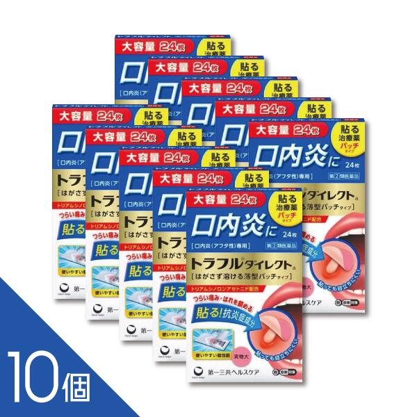~dfymshiteinirui~商品区分【第(2)類医薬品】 商品名:トラフルダイレクトaメーカー: 第一三共ヘルスケア○特徴こんな口内トラブル、ありませんか?・しみて美味しく食事がとれない・痛くてしゃべるのがつらい・気になって仕事に集中できない●すぐれた効き目の抗炎症成分トリアムシノロンアセトニド(ステロイド成分)を配合。●患部に直接作用して炎症や痛み、はれをしずめ、つらい口内炎を治します。●はがさず溶けてなくなる薄型フィルムタイプのお薬です。○してはいけないこと(守らないと現在の症状が悪化したり、副作用が起こりやすくなります)1.次の人は使用しないで下さい。(1)感染性の口内炎が疑われる人(医師、歯科医師、薬剤師又は登録販売者に相談して下さい)・ガーゼなどで擦ると容易にはがすことのできる白斑が口腔内全体に広がっている人(カンジダ感染症が疑われます)・患部に黄色い膿がある人(細菌感染症が疑われます)・口腔内に米粒大〜小豆大の小水疱が多発している人、口腔粘膜以外の口唇、皮膚にも水疱、発疹がある人(ウイルス感染症が疑われます)・発熱、食欲不振、全身倦怠感、リンパ節の腫脹などの全身症状がみられる人(ウイルス感染症が疑われます)(2)口腔内に感染を伴っている人(ステロイド剤の使用により感染症が悪化したとの報告があることから、歯槽膿漏、歯肉炎等の口腔内感染がある部位には使用しないで下さい)(3)5日間使用しても症状の改善がみられない人(4)1〜2日間使用して症状の悪化がみられる人○相談すること1.次の人は使用前に医師、歯科医師、薬剤師又は登録販売者に相談して下さい。(1)医師又は歯科医師の治療を受けている人(2)妊婦又は妊娠していると思われる人(3)授乳中の人(4)高齢者(5)薬などによりアレルギー症状を起こしたことがある人(6)患部が広範囲(患部を本剤でおおいきれない)にある人2.使用後、次の症状があらわれた場合は副作用の可能性がありますので、直ちに使用を中止し、この文書を持って医師、歯科医師、薬剤師又は登録販売者に相談して下さい。関係部位・・・症状口腔内・・・白斑(カンジダ感染症が疑われる)、患部に黄色い膿がある(細菌感染症が疑われる)その他・・・アレルギー症状(気管支喘息発作、浮腫等)3.使用後、次の症状があらわれた場合には、感染症による口内炎や他疾患による口内炎が疑われますので、使用を中止し、この文書を持って医師、歯科医師、薬剤師又は登録販売者に相談して下さい。発熱、食欲不振、全身倦怠感、リンパ節の腫脹、水疱(口腔内以外)、発疹・発赤、かゆみ、口腔内の患部が本剤でおおいきれないくらい広範囲に広がる、目の痛み、かすみ目、外陰部潰瘍○効能効果口内炎(アフタ性)○用法用量年齢・・・使用方法成人(15歳以上)・・・1患部に、1回1枚、1日1〜2回 白色面を患部粘膜に付着させて用います。小児(5歳以上)・・・1患部に、1回1枚、1日1〜2回 白色面を患部粘膜に付着させて用います。5歳未満・・・使用しないで下さい。使用方法〔トラフルダイレクトaは貼って治すお薬です。〕本剤は口腔内貼付剤ですので、内服せず(飲み込まないこと)下記の方法により患部に貼り付けて下さい。本剤が対象とする「口内炎(アフタ性)」は、右図のように頬の内側や舌、唇の裏側などに、周りが赤っぽく、中央部が浅くくぼんだ白っぽい円形の痛みを伴う浅い小さな潰瘍(直径10mm未満)が1〜数個できた炎症の総称です。[患部を拭く]1.口内炎ができている部分にティッシュペーパーやガーゼなどを軽くあてて、唾液を拭き取って下さい。[フィルムを取り出す]2.アルミシートを開け口からゆっくりはがし、本剤(フィルム)だけを取り出して下さい。3.指先で本剤(フィルム)をつまみ上げ、表裏(ピンク色の面と白色面)を確かめて下さい。ピンク色(外側・外から見える面)白色(患部側・貼り付ける面)[貼って押さえる]鏡を見ながら患部をおおうように貼り、しっかりと押さえます。4.白色面を患部に軽く押し当て、1、2、3と、約3秒間指先で押さえた後、指先を離して下さい。■うまく貼り付かない場合には、押さえる時間を長くして試してみて下さい。■周囲までしっかり押さえるように貼って下さい。貼り付きが弱いところがあると、はがれやすくなります。[なるべく触れない]5.貼付後、数分間は位置がずれることがあるので、なるべく舌で触れないようにして下さい。(就寝前にも使用できます)■貼った直後は、飲食を控え、なるべくそっとしておいて下さい。[はがさず溶けてなくなる]6.時間がたつと自然に溶けてなくなりますので、無理にはがさないで下さい。(1)用法・用量を厳守して下さい。(2)本剤は時間がたつと自然に溶けてなくなりますので、無理にはがさないで下さい。(3)痛みが治まったら使用を終了して下さい。(使用中のものをはがし取る必要はありません)(4)小児に使用させる場合には、保護者の指導監督のもとに使用させて下さい。(5)5歳未満の乳幼児には使用させないで下さい。(6)小児への使用においては