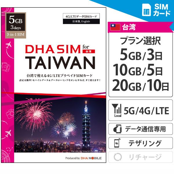 台湾 SIMカード 3日/5日/10日間 プリペイドSIM 簡単設定 説明書付 4G/LTE回線 データ通信専用 simフリー端末のみ対応 【出発前のアクティベーションが必要です】 商品到着後、必ずご渡航の3日前までに当社ホームページにて、SIMのアクティベーションを完了してください。 【各国最大手キャリアの回線で高速通信!】 台湾最大手キャリアの回線で広範囲の高速通信! 【使用可能端末】 SIMフリー iPhone / スマホ / タブレット でご利用が可能です。テザリングをご利用いただけます。 【対応バンド】4G/LTE:B3/7/8 【対応SIM】3in1(標準/マイクロ/ナノ) 【製品パッケージ】simカード/simピン/説明書 【利用方法】 1.パッケージに記載のQRコード及びURLからアクティベーション申請ページへいきます。 2.申請ページでパッケージに記載されている「商品型番(DHA-SIM-XXX)」、SIMカードに記載されている「SIM番号」を入力し、申請を行います。 3.現地到着後SIMカードを差し込み、『設定』から『モバイルデータ』、『データローミング』及び『5G/4G/LTE』をそれぞれオンで設定完了、ご利用可能となります。 【面倒な契約なし!サポートも充実】 個人認証、クレジットカード登録、契約、事務手数料等は一切不要です。株式会社DHA Corporationは日本のMVNO(仮想移動体通信事業者、届出番号A-30-16419)です。 販売からサポートまでを一貫して提供しており、日本語/英語/中国語でのサポートを行っております。商品や設定方法などについてわからないことがございましたら遠慮なくご連絡ください。台湾 SIMカード 3日間 5日間 10日間 プリペイドSIM 簡単設定 4G/LTE回線 データ通信専用 simフリー端末のみ対応 1,680円 税込 送料込 カードOK レビュー25件 DHA ダイレクト 楽天市場店 ![]() | ||