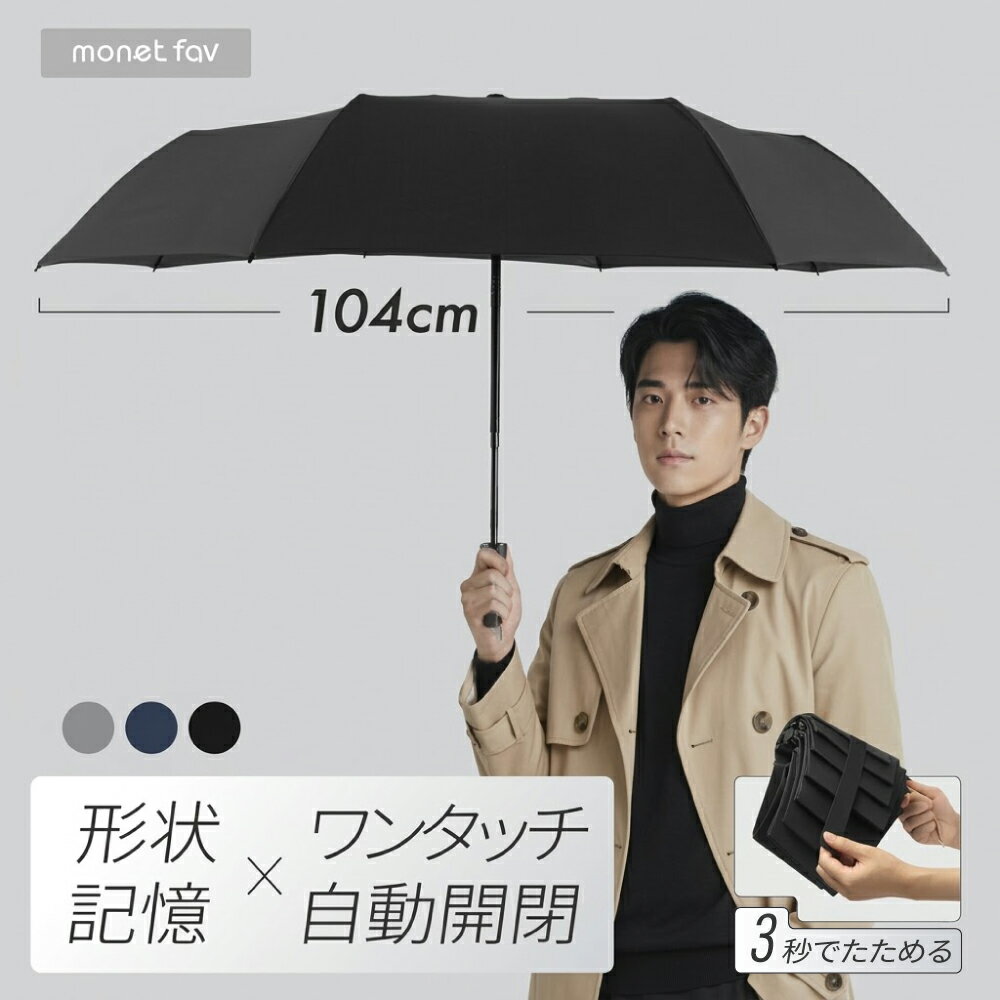 主な特長 “もう傘でイラつかない。” 3秒でキレイに畳める、新基準の折りたたみ傘。 毎回グシャっとなる折りたたみ傘――そのストレスを丸ごと解決。 形状記憶シートでサッとまとまるから、たたむ時間わずか3秒。 ・形状記憶シートで“3秒でキレイたためる”ストレスフリー構造 ・片手で操作できるワンタッチ自動開閉 ・8本骨+グラスファイバーで強風にも強い ・直径104cmのゆったりサイズで濡れにくい ・高撥水加工で雨粒をはじき、すぐ乾く 〈 こんなシーンで… 〉 ・朝の通勤・通学で急に雨が降ったとき ・車の乗り降りで片手しか使えないシーン ・雨の日でもきれいにスマートに過ごしたいとき ・ギフトや贈り物に実用性の高いアイテムを探している人に 「急ぐ朝も、荷物が多い日も、雨に振り回されない。」 たたみやすさ・丈夫さ・使いやすさ、その全部を詰め込んだ一本で、 雨の日の不便をまるごと解消しよう。 サイズ 展開時:全長 約65cm × 直径104cm収納時:全長 約34cm 重量 約425g 素材 骨:ステンレス+グラスファイバー生地:ポリエステル 商品区分 保証タイプA / 通常在庫 →保証・配送について「お買い物ガイド」を確認 備考 ・商品写真は実物に近い色に調整していますが、実際の色味と異なる場合がございます。 折りたたみ傘 形状記憶 ワンタッチ 自動開閉 高撥水 軽量 8本骨 強風対策 コンパクト 晴雨兼用 たたみやすい スマート傘 丈夫 メンズ レディース 通勤 通学 旅行 プレゼント ギフト 防水 上品 おしゃれ 風に強い 大きめ 撥水速乾 収納簡単 使いやすい 自動開閉傘 3秒でたためる 折畳傘 グレー ネイビー ブラック 【広告文責】日翔株式会社 03-5829-8823 【メーカー】日翔株式会社 【区分】日用品Related Items 形状記憶 折りたたみ傘 3,980円 形状記憶 折りたたみ傘 3,980円 折りたたみ日傘 楽傘 2,980円 3,980円 税込 送料込 カードOK レビュー3件 monet fav 楽天市場店 ![]() | ||