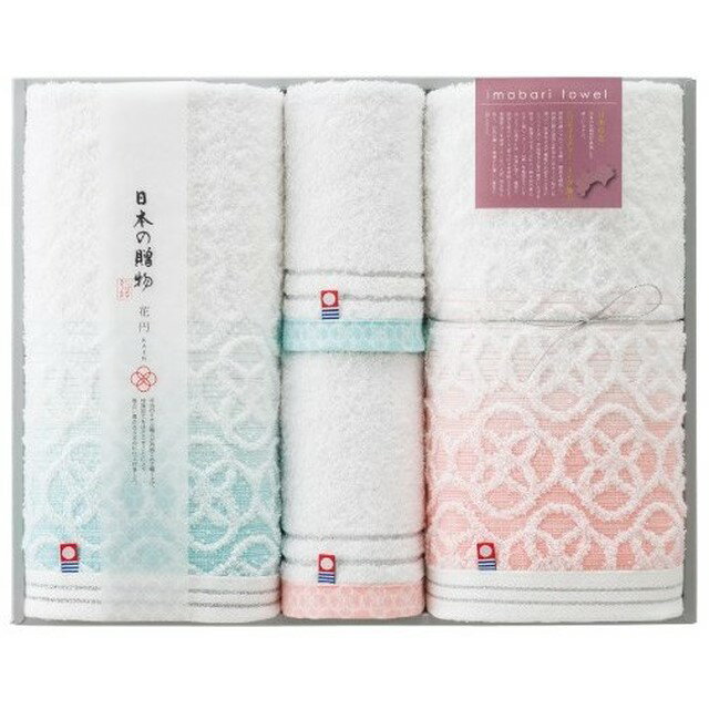 商品情報サイズバスタオル(約60×110cm)×3枚フェイスタオル(約34×75)×2枚ウオッシュタオル(約34×31)×1枚箱寸(300×400×80mm)素材バスタオル:綿100%(日本製)フェイスタオル:綿100%(日本製)ウオッシュタオル:綿100%(日本製)【今治謹製タオルセット】(日本製) IM-7711 〜伝統の今治〜IMABARI 感謝の気持ちを込めて贈る。伝統と職人芸が織りなす今治・紋織 今治 来島海峡波文様 紋織タオル 伝統を今に伝える誇りとこだわり。今治で磨き上げられてきた織り技をお届けいたします。歴史と文化の由緒のある町「今治」奈良時代から築き上げた織の技と蒼社川の名水。大正からの日本ジャガード紋織タオルの先駆けとしての自信と誇りが今治にはあります。世界に誇れる「今治謹製」の心地よさを感じてみてください。 品質基準クリアーの今治タオル こだわりの逸品MADE IN JAPAN エレガントで芸術的デザインの紋織 身の回りのものでチョット良いものを使いたい方に 品質を重視される方に 贈り物として信頼できるものをお探しの方に こんにちは!店長のニイツマです。こちらの商品は、吸水性に優れ、厳しい基準をクリアーした今治タオルです。トータルバランスを追求した高級タオルですので、幅広い方から支持されると思います。あらゆるシーンで安心してお使いいただけます。 1 9,350円 税込 送料別 カードOK 贈りもの専科エレガ ![]() | ||