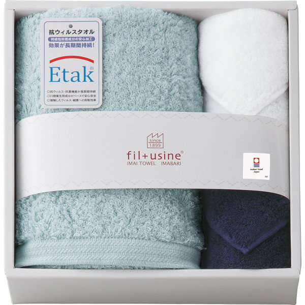 【商品説明】 Etak(イータック)加工を施したタオルは、ウイルス・菌に対して高い効果を実証。 ウイルス・細菌が接触後すぐに効果を発揮し、洗濯・乾燥後も抗ウイルス・抗菌機能が持続します。 ※全てのウイルス・菌に対して効果があるわけではありません。※使用状況により持続力が異なります。 ■商品サイズ フェイスタオル:約34×80cm タオルハンカチ:約25×25cm 化粧箱:約22×22×7cm ■材質 綿100% ■重量 約355g ■内容 フェイスタオル1枚 タオルハンカチ2枚 ■原産国 日本製 【注意事項】 ●お急ぎの方はお気軽にお問合せください。 ●在庫管理には気をつけておりますが、在庫は流動的ですので万一品切れの場合はご容赦ください。 ●品切れや、入荷待ちとなる場合は電話またはメールでご連絡させていただきます。 日本製 今治タオル ギフト 贈り物 プレゼント お礼 お祝い お返し 内祝 結婚式 引出物 二次会 出産 快気祝 新築祝 香典返し 敬老の日 母の日 父の日 法事 引越し ご挨拶 記念品 お中元 お歳暮 お年賀 3,300円 税込 送料別 カードOK イベント企画ノベルティセンター ![]() | ||