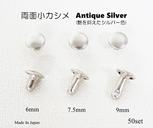 〇素材 鉄 〇カラー アンティークシルバー(艶を抑えたシルバー色, ASL) 〇サイズ 頭6mm 足6mm, 7.5mm, 9mm(頭の頂点から足の先端までの長さ) (※実際の足のみの長さは、それぞれ約-1mmほどです) 〇個数 50個入り 日本製のアンティークシルバー色の両面小カシメです。 サイズ展開は6mm, 7.5mm, 9mmからお選びいただけます。 レザークラフト、ハンドメイド材料にぜひお使い下さいませ。 ※お得な200個セットも販売しています。 352円 税込 送料別 カードOK KUME KOUBOU ![]() | ||