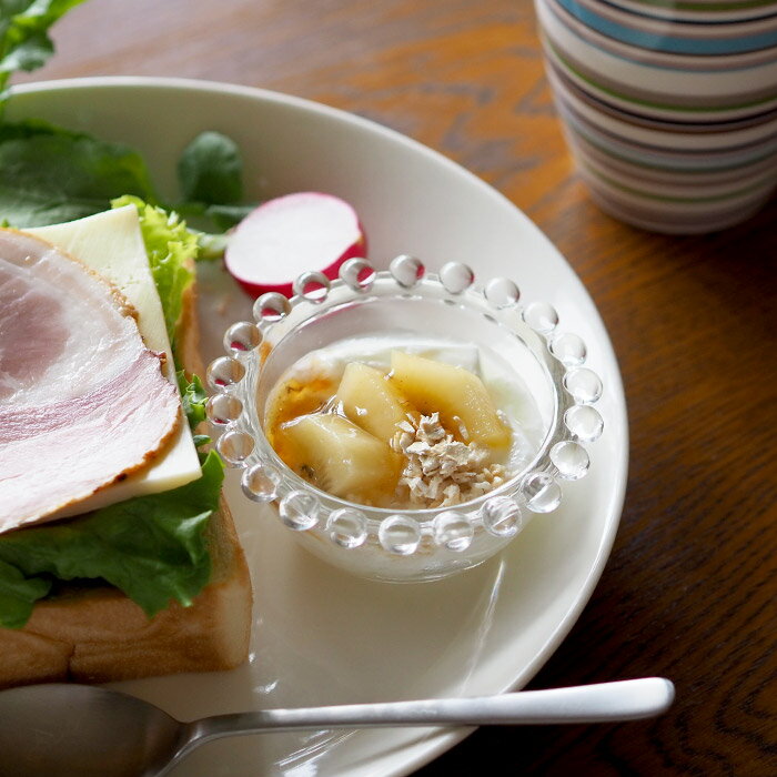 サイズ(目安) φ9(内寸φ6.5)×H3.9cm 重量(目安) 108g 材質 全面物理強化ガラス(耐熱温度差 約120℃) 使用区分 電子レンジ ○、食洗機 ○、オーブン ×、直火 × 原産国 日本 スタッフのおすすめポイント 小さなガラス玉の縁取りはまるでネックレスのような可愛らしさ。キラキラと輝いてとても綺麗です。ジャムやソースを入れるのにちょうどいいサイズです。アクセサリーやボタンなどの小物入れとしても。厚手で丈夫なガラスなので普段使いにぴったりです。 ■ご確認ください ●衝撃や急熱、急冷でヒビワレやカケが発生することがありますので、ご注意ください。 ●金属タワシ、研磨剤付ナイロンタワシやクレンザーはご使用にならないでください。表面にキズがつく恐れがあります。 ●表面に曇り(細かい傷の集まり)が生じている場合は使用しないでください。電子レンジ、食洗機は使用できますが、傷などがあると破損に繋がりますので、十分にご注意ください。また、破損した場合細かい破片が激しく飛び散る可能性があります。 ※ラッピングをご希望の方はこちらをご覧ください。 1,210円 税込 送料別 カードOK レビュー2件 プロキッチン ![]() | ||