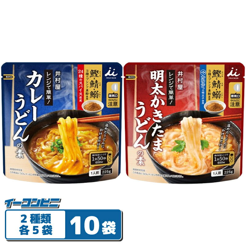 レンジ調理でうどんにかけるだけ! 「具材入りのカレーうどん」/「ふわふわなたまご入りの明太かきたまうどん」を作ることができます。 2種類の詰め合わせセットをご用意しました♪ 【セット内容】 ●カレーうどんの素 225g・・・5袋 24種のスパイスと魚粉使用でこだわりの味わいに仕上げました。 ●明太かきたまうどんの素 225g・・・5袋 たまごと明太子使用でこだわりの味わいに仕上げました。 計10袋 2,476円 税込 送料別 カードOK イーコンビニ2号店 ![]() | ||