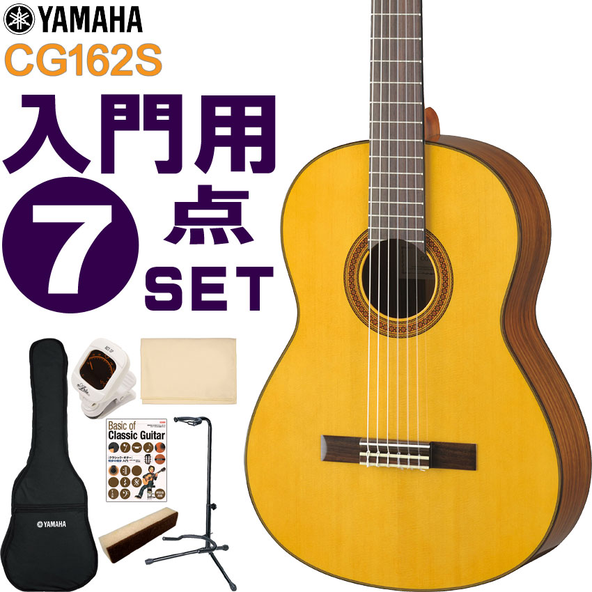 -5. 最初に全て揃います!確かな作りで長く愛用できるギターです クラシックギター 初心者セット YAMAHA CG162S ヤマハ ハードケース付 14点 入門セット スプルース材単板 オバンコール材 クラシックギター 初心者セット YAMAHA CG162S ヤマハ ハードケース付 14点 入門セット スプルース材単板 オバンコール材 ■ 最初に全部揃える! 完全セット 楽器の演奏が初めての方でも大丈夫。他になにか揃えなくても大丈夫。最初に全部揃えて快適に始められるセットです。 ・(お届け セット内容) ・1. 初級 教材 : 初級 教材 : ビギナー用 教則DVD付属 教則本) ・教本だけではわかりにくい(指の動き)や(実際の音)など、動画で確認しながら練習できるから、初めてでも、独学でも上達できます。最初の基本がわかります。 ・2. チューナー (チューニングメーター) ・弦の音が高いのか低いのか、画面の表示で目で見て分かるから、簡単に音合わせできます! ・初心者でも使いやすいクリップタイプのクリップチューナー。 ・3. ギターミュート (弱音機) ・弾き心地は変わらずに音量だけが減少します。家族や近所、夜間など、周りを気にせず好きな時間にいつでも練習できるから上達が早い! ・4. 足台 ・足を乗せる事で、ギターを弾きやすい角度に固定します。 ・5. 譜面台 ・楽譜が目線の位置で見やすく、正しい姿勢で楽に演奏できます。 ・6. ギタースタンド ・倒さない様に置き場に困るギター。スタンドなら安定して置く事ができて安心です。コンパクトな折りたたみスタンド。 ・7.クラシックギター弦 (替え弦) ・弦は消耗品。慣れないチューニングなどで切ってしまった時にも安心。(1弦〜6弦)のセット弦。 ・8.ストリングワインダー ・面倒な弦交換が簡単に素早く行えます。 ・9. ギターポリッシュ ・塗装面の汚れを落として艶を出します。 ・10. お手入れクロス ・汚れをサッと一拭き ・11. ギターピック ・クラシック音楽の演奏では使いませんが、弾き語りやメロディの演奏などに使用する機会が多いという声にお応えしてピックを付属しています。6種類の中から、自分に合ったピックが見つかります。 ・12. ピックケース ・無くしやすいピックをしっかり保管。 ・13. ギターケース (バッグ) ・持ち運びや保管が安心のハードケース ・14. ギター本体 ・木材料の個体差、照明、モニター環境で、画像と実物の色が多少異なって見える場合があります。 ■ ギター本体 Classic Guitar YAMAHAは厳選された木材を使って、伝統的な工法で丁寧に作られているから「弾きやすく」て「音が良い」。弾きやすいから続けられる。音が良いから演奏が楽しい。 ■ ボディサイズ ■ 標準サイズ(4/4)サイズ。 ■ 全長 : 995ミリ ■ 胴厚 : 94〜100ミリ ■ クラシックギターは、ボディの大きなフォークギターよりも「小振り」です。小柄な方でも比較的持ちやすく、楽に演奏できます。 ■ スケール (弦長) ■ 弦長(スケール) : 650ミリ ■ ナット幅 : 52ミリ ■ 木材料 ■ 表板にはスプルース材を使用。合わせ板ではなく、一枚板の「単板」を使う事で格段に響きが良くなっています。 ■ 側板/裏板には、オバンコール材を使用。スプルース材とオバンコール材はヤマハクラシックギターではベーシックな木材料の組合せです。 ■ 芯がある明瞭な音色で、音の強弱を出しやすい。重厚な響きは存在感があり、アンサンブルでも埋れません。 ■ 弦 (ナイロン弦)、ネック幅 ■ 手触りが柔かく、弦の張力も弱いナイロン弦が張られています。優しい音色を楽しめます。 ■ ナイロン弦は弾いた時の振幅が大きく、弦同士が当たらない様にネックがやや幅広に作られています。 ■ 特徴 ■ 上質な木材料のスプルース材単板を使い、丁寧にしっかりと仕上げたベーシックモデル。 ■ 確かな作りの長く愛用できるギターで始めたい方に最適です。 ■ 演奏中に手が触れる部分など、細部まで丁寧に仕上げられ、初心者でも弾きやすく作られています。 クラシックギター 初心者セット YAMAHA CG162S ヤマハ ハードケース付 14点 入門セット スプルース材単板 オバンコール材 ■ 補足説明 ■ どなたでも楽しめます。 ・大人(男性、女性)、子供(男子、女子)学生(小学生、中学生、高校生、大学生)小さなお子様(男の子、女の子) ■ 様々なプレイスタイルで楽しめます。 ・弾き語り、アンサンブル、バンド演奏、歌の伴奏、ソロギター(ギターソロ)を楽しめます。クラシックギターでは一般的な奏法の他、ストローク、アルペジオ、指弾き(フィンガーピッキング)、ピック弾きでの演奏も行われる事があります。 ■ 多様な音楽ジャンルで楽しめます。 ・クラシック、ボサノバ、フラメンコ、タンゴ、ラテンをはじめ、J-POP(Jポップ)、ロック、ブルース、フォークソング、カントリー、ラグタイム、ジャズはもちろん、演歌、童謡、民族音楽、ハワイアン、フラ(フラダンス)の演奏、メタルやヒップホップ、ブラックミュージックの味付け、サンプリングにも多用されています。 ■ 身近な楽器です。 ・楽譜が