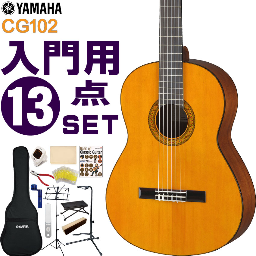 49. これだけ揃えば安心です!確かな作りで長く愛用できるギターです クラシックギター 初心者セット YAMAHA CG162C ヤマハ ハードケース付 12点 入門セット シダー材単板 オバンコール材 クラシックギター 初心者セット YAMAHA CG162C ヤマハ ハードケース付 12点 入門セット シダー材単板 オバンコール材 ■ これだけ揃えば安心! 充実セット 楽器の演奏が初めての方でも大丈夫。最初に揃えておきたい、練習で必要になるアイテムがひと通り揃ったセットです。 ・(お届け セット内容) ・1. 初級 教材 : 初級 教材 : ビギナー用 教則DVD付属 教則本) ・教本だけではわかりにくい(指の動き)や(実際の音)など、動画で確認しながら練習できるから、初めてでも、独学でも上達できます。最初の基本がわかります。 ・2. チューナー (チューニングメーター) ・弦の音が高いのか低いのか、画面の表示で目で見て分かるから、簡単に音合わせできます! ・初心者でも使いやすいクリップタイプのクリップチューナー。 ・3. ギターミュート (弱音機) ・弾き心地は変わらずに音量だけが減少します。家族や近所、夜間など、周りを気にせず好きな時間にいつでも練習できるから上達が早い! ・4. ギタースタンド ・倒さない様に置き場に困るギター。スタンドなら安定して置く事ができて安心です。コンパクトな折りたたみスタンド。 ・5.クラシックギター弦 (替え弦) ・弦は消耗品。慣れないチューニングなどで切ってしまった時にも安心。(1弦〜6弦)のセット弦。 ・6 ストリングワインダー ・面倒な弦交換が簡単に素早く行えます。 ・7. ギターポリッシュ ・塗装面の汚れを落として艶を出します。 ・8. お手入れクロス ・汚れをサッと一拭き ・9. ギターピック ・クラシック音楽の演奏では使いませんが、弾き語りやメロディの演奏などに使用する機会が多いという声にお応えしてピックを付属しています。6種類の中から、自分に合ったピックが見つかります。 ・10. ピックケース ・無くしやすいピックをしっかり保管。 ・11. ギターケース (バッグ) ・持ち運びや保管が安心のハードケース ・12. ギター本体 ・木材料の個体差、照明、モニター環境で、画像と実物の色が多少異なって見える場合があります。 ■ ギター本体 Classic Guitar YAMAHAは厳選された木材を使って、伝統的な工法で丁寧に作られているから「弾きやすく」て「音が良い」。弾きやすいから続けられる。音が良いから演奏が楽しい。 ■ ボディサイズ ■ 標準サイズ(4/4)サイズ。 ■ 全長 : 995ミリ ■ 胴厚 : 94〜100ミリ ■ クラシックギターは、ボディの大きなフォークギターよりも「小振り」です。小柄な方でも比較的持ちやすく、楽に演奏できます。 ■ スケール (弦長) ■ 弦長(スケール) : 650ミリ ■ ナット幅 : 52ミリ ■ 木材料 ■ 表板にはシダー材を使用。合わせ板ではなく、一枚板の「単板」を使う事で格段に響きが良くなっています。 ■ 側板/裏板には、オバンコール材を使用。シダー材とオバンコール材はヤマハクラシックギターではベーシックな木材料の組合せです。 ■ ふくよかな音色で、弾いた時の反応が良く音を出しやすい。重厚な響きは存在感があり、アンサンブルでも埋れません。 ■ 弦 (ナイロン弦)、ネック幅 ■ 手触りが柔かく、弦の張力も弱いナイロン弦が張られています。優しい音色を楽しめます。 ■ ナイロン弦は弾いた時の振幅が大きく、弦同士が当たらない様にネックがやや幅広に作られています。 ■ 特徴 ■ 上質な木材料のシダー材単板を使い、丁寧にしっかりと仕上げたベーシックモデル。 ■ 確かな作りの長く愛用できるギターで始めたい方に最適です。 ■ 演奏中に手が触れる部分など、細部まで丁寧に仕上げられ、初心者でも弾きやすく作られています。 クラシックギター 初心者セット YAMAHA CG162C ヤマハ ハードケース付 12点 入門セット シダー材単板 オバンコール材 ■ 補足説明 ■ どなたでも楽しめます。 ・大人(男性、女性)、子供(男子、女子)学生(小学生、中学生、高校生、大学生)小さなお子様(男の子、女の子) ■ 様々なプレイスタイルで楽しめます。 ・弾き語り、アンサンブル、バンド演奏、歌の伴奏、ソロギター(ギターソロ)を楽しめます。クラシックギターでは一般的な奏法の他、ストローク、アルペジオ、指弾き(フィンガーピッキング)、ピック弾きでの演奏も行われる事があります。 ■ 多様な音楽ジャンルで楽しめます。 ・クラシック、ボサノバ、フラメンコ、タンゴ、ラテンをはじめ、J-POP(Jポップ)、ロック、ブルース、フォークソング、カントリー、ラグタイム、ジャズはもちろん、演歌、童謡、民族音楽、ハワイアン、フラ(フラダンス)の演奏、メタルやヒップホップ、ブラックミュージックの味付け、サンプリングにも多用されています。 ■ 身近な楽器です。 ・楽譜が読めなくても大丈夫。楽器の演奏経験がなくても、簡単なコードを覚えれば、お気に入りの曲に合わせて演奏を楽しめます。 ■ 楽しみ方はいろいろ! ・趣味とし
