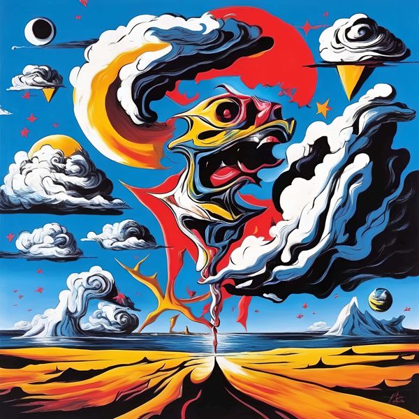 最初の商品画像がポスターの全体図です.2 番めの商品画像として中央部分の拡大図をのせています. 【GPT5/4o による解説】 (正確でない場合がありますので,ご注意ください.) この絵は,シュルレアリスムとポップアートの影響を受けた作品です. 鮮やかな色彩と幻想的な構図が特徴で,空に浮かぶ雲や奇妙な形状の生物が描かれています. 空の青と雲の白,そして赤や黄色のコントラストが視覚的なインパクトを与えています. 雲の中に潜む生物は,シュルレアリスムの巨匠であるダリの作品... 1,620円 税込 送料別 カードOK デイシン プライム ![]() | ||