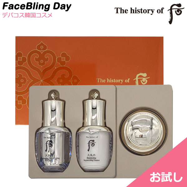 ●商品説明 王と王妃だけに捧げた天上の宮中秘方の拱辰緋緞と冬虫夏草成分で お肌を鎮静していたわります。 お肌の奥深くから光を与えるスキンケアラインです。 楽天海外直送 メーカー名 The history of 后/ドフー 会社住所 3/F,225, Paldal-ro, Wansan-gu, Jeonju-si, Jeollabuk-do, Republic of Korea,54999 商品区分 化粧品 製造国 韓国 輸入者名 本商品は個人輸入商品のため、購入者の方が輸入者となります。 構成 ●天気丹(チョンギダン) ファヒョンイルミネーティング·エッセンス 8ml ●天気丹(チョンギダン) ファヒョン アイセラム 8ml ●天気丹(チョンギダン) ファヒョンクリーム 10ml 使用上の注意 ■化粧品の使用中にお肌に異常が生じていないかよく注意して使用してください。 化粧品がお肌に合わないとき即ち次のような場合には、使用を中止してください。 そのまま化粧品類の使用を続けますと、症状を悪化させることがありますので、 皮膚科専門医等にご相談されることをおすすめします。 (1)使用中、赤味、はれ、かゆみ、刺激、色抜け(白斑等)や黒ずみ等の異常が あらわれた場合。 (2)使用したお肌に、直射日光があたって上記のような異常があらわれた場合。 ■目に入らないように注意し、万一目に入った場合は、すぐに洗い流してください。 ■傷や腫れもの、湿疹などの異常がある部位には使わないでください。 ■保管及び取扱い上の注意 (1)直射日光の当たる場所、極端な高温・低温の場所を避けて保管してください。 (2)お子様の手の届かないところに保管してください。 (3)使用後は必ずフタを閉めて保管してください。 (4)使用期限を過ぎた製品は使用しないでください。 【注意事項】 ・当店でご購入された商品は、原則として、「個人輸入」としての取り扱いになり、全て韓国の全州からお客様のもとへ直送されます。 ・個人輸入される商品は、全てご注文者自身の「個人使用・個人消費」が前提となりますので、ご注文された商品を第三者へ譲渡・転売することは法律で禁止されております。 ・通関時に関税・輸入消費税が課税される可能性があります。課税額はご注文時には確定しておらず、通関時に確定しますので、商品の受け取り時に着払いでお支払いください。詳細はこちらご確認下さい。 *色がある場合、モニターの発色の具合によって実際のものと色が異なる場合がある。 2,580円 税込 送料込 カードOK faceblingday楽天市場店 ![]() | ||