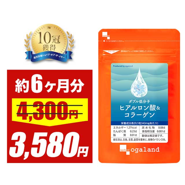 他の内容量はコチラ >> \ついでに購入!今週の100円サプリ/ ※5分おきに更新されます 商品名 W低分子ヒアルロン酸&コラーゲン 名称 ヒアルロン酸含有加工食品 内容量 343mg×180カプセル(4個セット・約12ヶ月分) 原材料 フィッシュコラーゲンペプチド(国内製造)、コーンスターチ、ツバキ種子エキス末/ゼラチン、ヒアルロン酸、グリセリン脂肪酸エステル、ショ糖脂肪酸エステル ※商品は原料由来の為、製造時期により色合いが多少異なる場合がございます。 お召し上がり方 1日に2〜4カプセルを目安にお召し上がりください。 ※薬を服用中あるいは通院中の方、妊娠・授乳中の方は医師にご相談の上お召し上がりください。 ※原材料をご確認のうえ、食物アレルギーのある方はご使用をお控えください。 ※開封後はチャックをしっかりと閉めて保存してください。 ※乳幼児の手の届かないところに保管してください。 ※食生活は、主食、主菜、副菜を基本に、食事のバランスを。 主要原料 (1カプセルあたり):フィッシュコラーゲンペプチド 150mg / ヒアルロン酸 6mg / 椿種子エキス末 1mg 剤形 ハードカプセル 保存方法 高温多湿をさけ、常温にて保存してください。 賞味期限 別途商品ラベルに記載 製造者 株式会社 オーガランド 〒899-4341 鹿児島県霧島市国分野口東1294番1 生産国 日本 広告文責 株式会社 オーガランド (0995-57-5032) 区分 健康食品 商品情報更新履歴 2023年1月30日 リニューアル。成分と配合量が変更になりました。 2025年4月11日 通常価格が変更になりました。 8,300円 税込 送料込 カードOK レビュー928件 サプリ専門店 オーガランド ![]() | ||