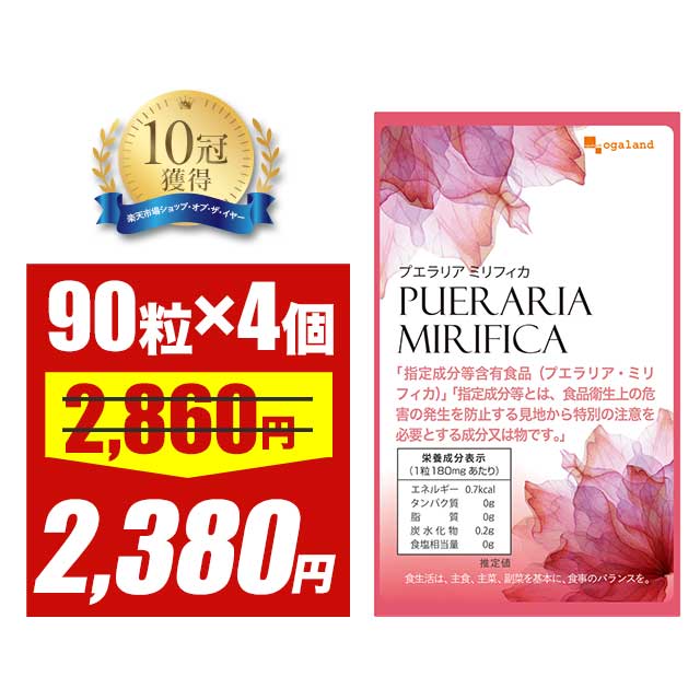 他の内容量はコチラ >> \ついでに購入!今週の100円サプリ/ ※5分おきに更新されます 商品名 プエラリアミリフィカ 名称 プエラリア・ミリフィカ末加工食品 内容量 180mg×90粒(4個セット・360粒) 原材料 プエラリア・ミリフィカ末(国内製造)、還元麦芽糖水飴、デキストリン/結晶セルロース、ステアリン酸Ca、微粒酸化ケイ素 ※商品は原料由来の為、製造時期により色合いが多少異なる場合がございます。 お召し上がり方 1日に1粒を目安に水また... 2,380円 税込 送料込 カードOK レビュー49件 サプリ専門店 オーガランド ![]() | ||